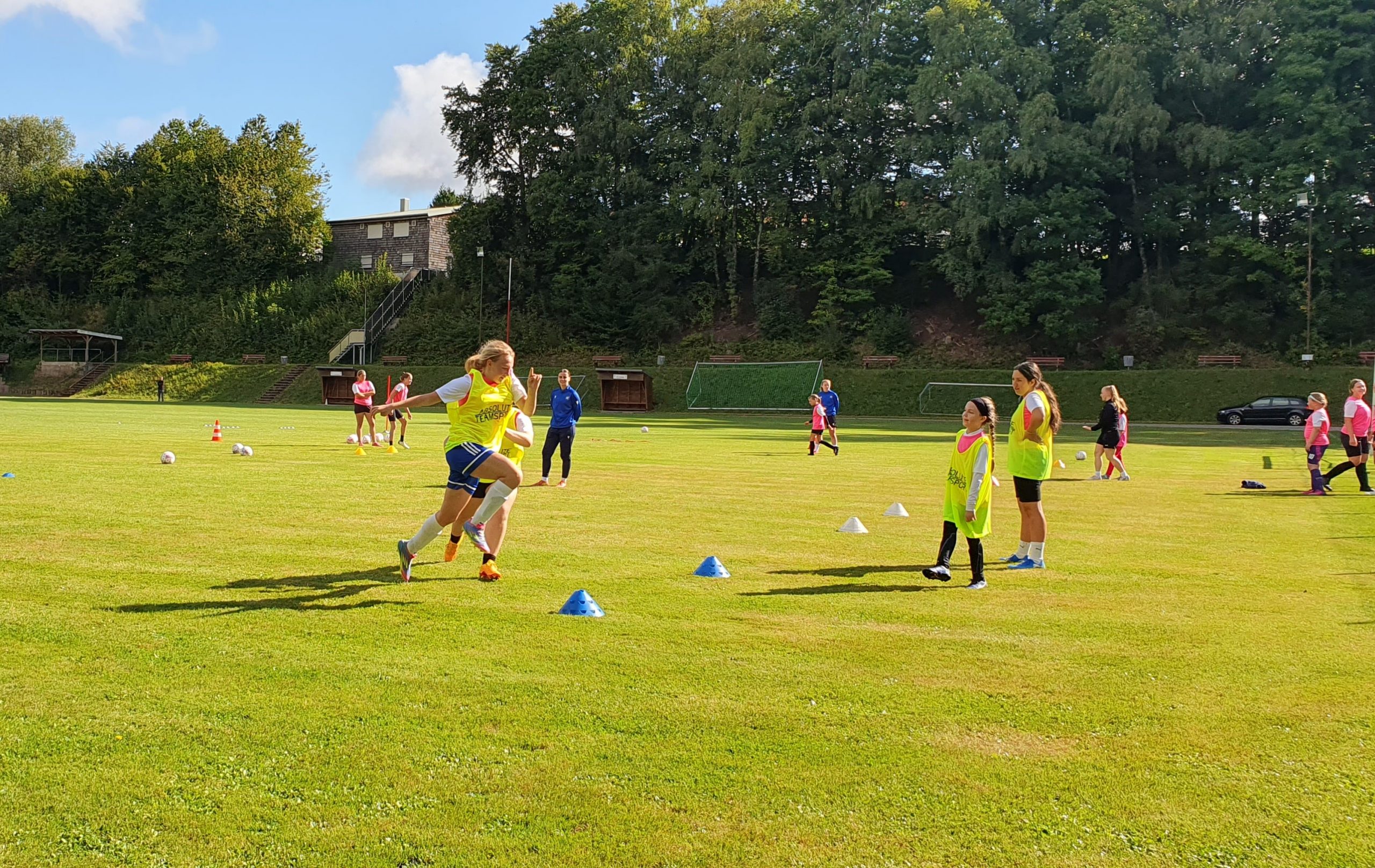 Am Samstag, 30.08. war dann Vertreterinnen des bfv und der AOK zu Gast in Schielberg. Nach einer kurzen Eröffnung mit Dankesworten und der Unterschrift des Kooperationsvertrags, standen zwei Spielerinnen von den KSC-Damen den vierzehn anwesenden Juniorinnen und deren Eltern Rede und Antwort auf alle ihre Fragen zum sportlichen Werdegang und wie sie zu Fußball als Hobby kamen. Nach einer abschließenden Ball-Jonglage der Beiden, gab es ein Gruppenfoto, ehe es für die erste von vier Trainingsstunden auf den Platz ging. Die Juniorinnen hatten viel Spaß und die Übungen waren fordernd, sodass sie auch ins Schwitzen kamen. Auch die beiden KSC-Spielerinnen mischten sich mit unter die Trainingsgruppe und waren somit nah an den Juniorinnen dran, was unseren Spielerinnen sehr imponierte. Nach 90 Minuten war die Einheit zu Ende. Die Mädels bedankten sich bei Laura Heldt für das tolle Training und der AOK für die Trainingsshirts, die sie im Anschluss behalten durften.
