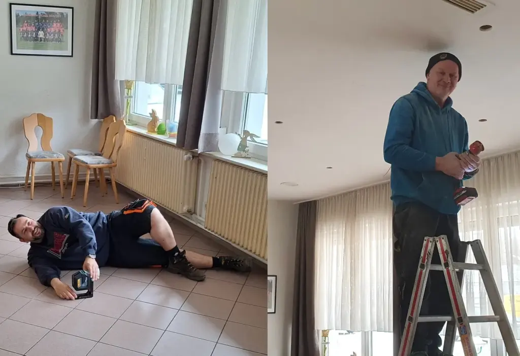Beim Arbeitsdienst im März stand neben vieler kleiner Aufgaben auch ein Großprojekt an: Die Sportheimbeleuchtung sollte auf stromsparende LED-Lampen umgestellt werden und bei dieser Gelegenheit ein besseres Lichtkonzept umgesetzt werden. So wurden die vier in die Jahre gekommenen Deckenleuchten demontiert, mit Hilfe von Lasern die Positionen der neuen Beleuchtung präzise angezeichnet und viele Löcher in die Decke gebohrt, um den Raum mit LED-Spots homogen auszuleuchten. Nun können Veranstaltungen im Sportheim im richtigen Licht erstrahlen und nebenbei Kosten eingespart werden.