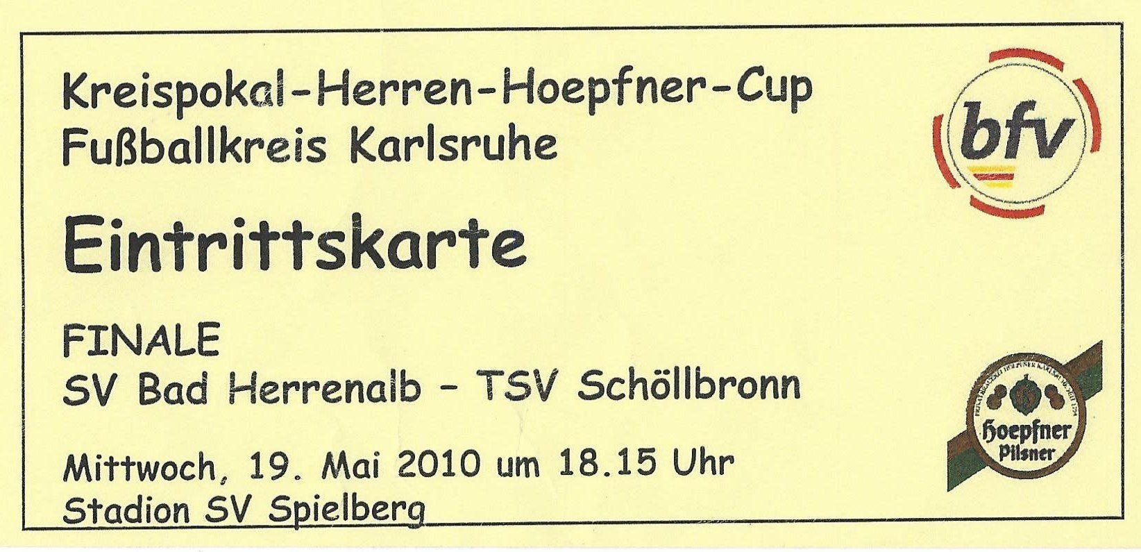 Das Finale ging dann knapp mit 0:1 verloren. Zu Beginn noch besser im Spiel und mit einer guten Chance zu Führung, wurden die favorisierten Schöllbronner im Verlauf stärker und erzielten den entscheidenden Treffer in der 30. Minute. Jedoch war es ein Spiel auf Augenhöhe und bis zum Abpfiff gaben die Spieler auf dem Platz und die mitgereisten Fans alles, um doch noch zum Erfolg zu kommen. Auch wenn nach dem Spiel die Köpfe hingen, da es nicht zum ganz großen Wurf reichte, war doch der Einzug ins Finale und die beeindruckende Atmosphäre des Spiels ein echtes Highlight für unsere Spieler und unserer Vereinsgeschichte. Wer sich nochmals ins Spielgeschehen zurückversetzen will, für den haben wir den Spielbericht der BNN vom 20.05.2010: