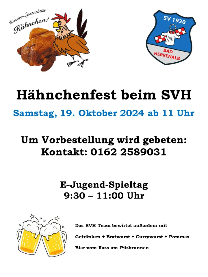 Am Samstag stand das Hähnchenfest an, welches aus dem traditionellen AH-Sportfest heraus entstand, als dieses zur Corona-Zeit nicht durchführbar war. Den Anfang machte die E-Jugend mit einem Heimspieltag, bei welchem wir ab 9:30 Uhr mit zwei Teams vertreten waren und zwei weitere Teams zu Gast hatten. Von 11 bis 19 Uhr herrschte ein reges Kommen und Gehen und viele Hähnchen flogen über die Theke zu ihren glücklichen Gästen. Bei trockenem herbstlichem Wetter verweilten auch viele Gäste am Sportheim mit Getränken, Bratwurst und Pommes bei geselliger Musik und in netter Runde. Vielen Dank an alle Gäste und auch an alle Helfer, die zum Gelingen beigetragen haben.