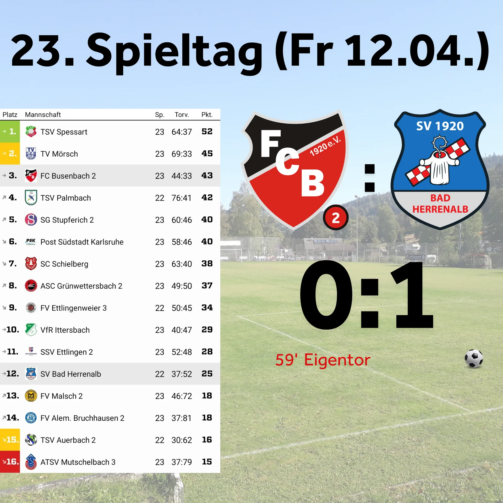 In Halbzeit zwei liefen wir die Gegner noch früher an, womit diese Schwierigkeiten hatten. Es dauerte bis zur 59. Minute, ehe das Tor fiel. Der Verteidiger von Busenbach spielte zurück zum Torhüter, der links neben dem Tor stand und von dort zum linken Innenverteidiger spielte, der einen unserer Spieler im Rücken hatte und den Ball aus der Drehung Richtung eigenes Tor zurückspielte. Damit überraschte er seinen Torhüter, sodass der Ball ins Tor rollte. Kurze Zeit später sah Streeb unnötigerweise die Ampelkarte. In Unterzahl und trotz Gegnerdruck verteidigten wir souverän. Kurz vor Spielende verletzte sich ein Busenbacher (#15) ohne Gegnereinwirkung schwer und musste mit dem RTW abgeholt werden. Gute Besserung an dieser Stelle! Am Ende stand ein wichtiger Sieg auf dem Konto und man kann mit Rückenwind in die Derbywoche starten.
