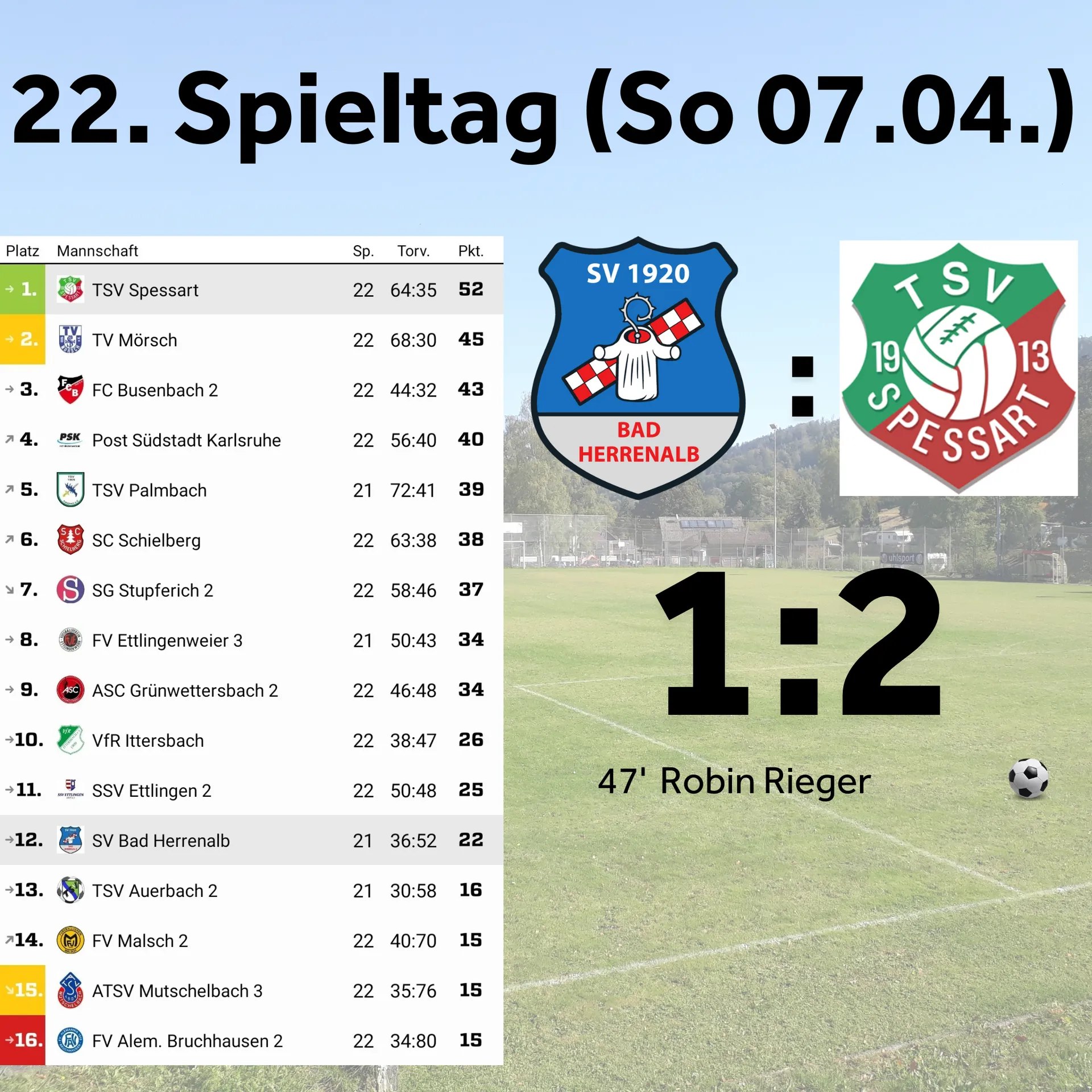 Aus der Pause kamen wir mit viel Schwung und drückten Spessart zunächst hinten rein. So kamen wir auch schnell durch einen Freistoß zum Ausgleich. Sadler brachte diesen aus dem Halbfeld auf den kurzen Pfosten, wo Rieger den Ball ins lange Eck einköpfte. Wir hielten den Druck hoch und erspielten uns noch weitere Chancen, die jedoch glücklos vergeben wurden. Spessart konnte sich nur mit langen Bällen befreien, welche unsere Abwehr souverän klärte. Wie es dann jedoch ist, wenn man oben bzw. unten drin steht, fällt das Spielglück auf die Seite der Mannschaft mit einem positiven Lauf. So führte ein solcher langer Ball kurz vor Ende zu einem Missverständnis zwischen Torhüter Halilaj und Verteidiger Niesner. Der spessarter Angreifer setzte nach und spitzelte den Ball nach vorne auf seinen Mitspieler, der allein zwischen Tor und vor allem hinter Torhüter Halilaj im Abseits stand und den Ball versenkte (84`). Wir warfen nochmals alles nach vorne, wobei die beste Chance durch Rieger knapp am Winkel vorbeiflog. So blieb es trotz einer richtigen und wichtigen Reaktion der Mannschaft bei der unglücklichen 1:2 Niederlage gegen Tabellenführer Spessart.