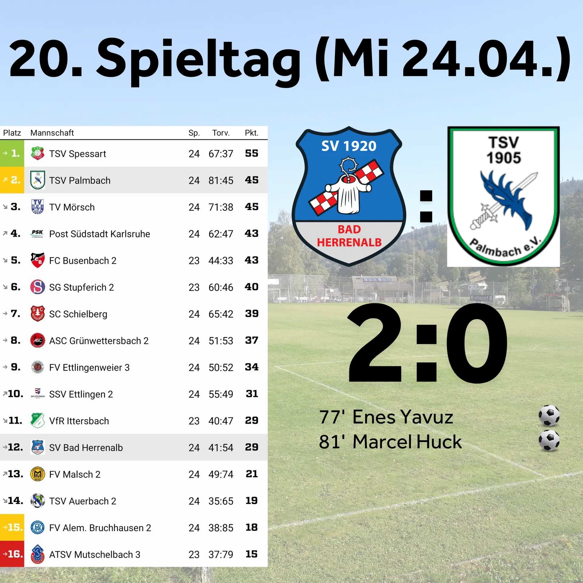 Aus der Pause kamen wir mit mehr Schwung und Wille, was sich im hohen Anlaufen und starker Zweikampfquote zeigte. Bereits früh scheiterten wir mit einem Schuss, der knapp am langen Pfosten vorbei ging. Palmbach kam nur noch zu Halbchancen, welche Halilaj sicher aufnahm und schnell den Gegenangriff einleitete. Einen solchen nutzte der laufstarke Sadler auf der linken Seite mit einem Dribbling und Laufduell bis kurz vor die Grundlinie. Seine präzise Flanke flog über den Verteidiger in der Mitte hinweg auf den am langen Pfosten lauernden Yavuz, der ohne Gegnerdruck zum verdienten 1:0 (77`) einköpfte. Das Spiel wurde in der Folge hitziger mit vielen intensiven Zweikämpfen. Der Schiedsrichter legte seinen Fokus dann auch mehr auf Duelle, sodass er auch klares Seitenaus direkt vor dem Linienrichter, welcher die Fahne hob, nicht pfiff. Aus dieser heißen Phase gingen wir nach einem Freistoß aus dem Halbfeld als Gewinner hervor. Huck, der bereits in der ersten Hälfte für den angeschlagenen Trötschel kam (gute Besserung an dieser Stelle), stieg am höchsten und nickte den Freistoß von Hartmann zum entscheidenden 2:0 in die Maschen (82`). In der Folge flachte das Spiel ab, weil sich Palmbach geschlagen gab und wir die Führung verwalteten. In Summe ein verdienter Arbeitssieg, der wichtige Punkte bringt, die den Abstand zu den Abstiegsrängen sichern.