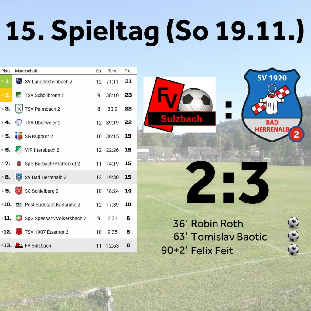 Die Gegner der ersten Mannschaft, SG Stupferich, sagten den Spieltag wegen ihres tiefen und nassen Platzes ab und so fuhren viele mit nach Sulzbach, um die Zweite Mannschaft anzufeuern. Mit Roth und den Hartwich-Brüdern standen bei uns gleich drei Ex-Sulzbacher in der Startelf. Leider mussten wir früh das 1:0 hinnehmen, konnten jedoch mit Roth durch einen Ex-Sulzbacher noch vor der Pause das 1:1 erzielen. Nach der Pause konnte Baotic das verdiente 1:2 (63`) schießen, aber die Gastgeber kamen erneut zum Ausgleich (78`). Als es trotz vielen schönen Angriffen von uns schon nach einer Punkteteilung aussah, erzielte Feit in der 92. Minute noch den 2:3 Siegtreffer.
