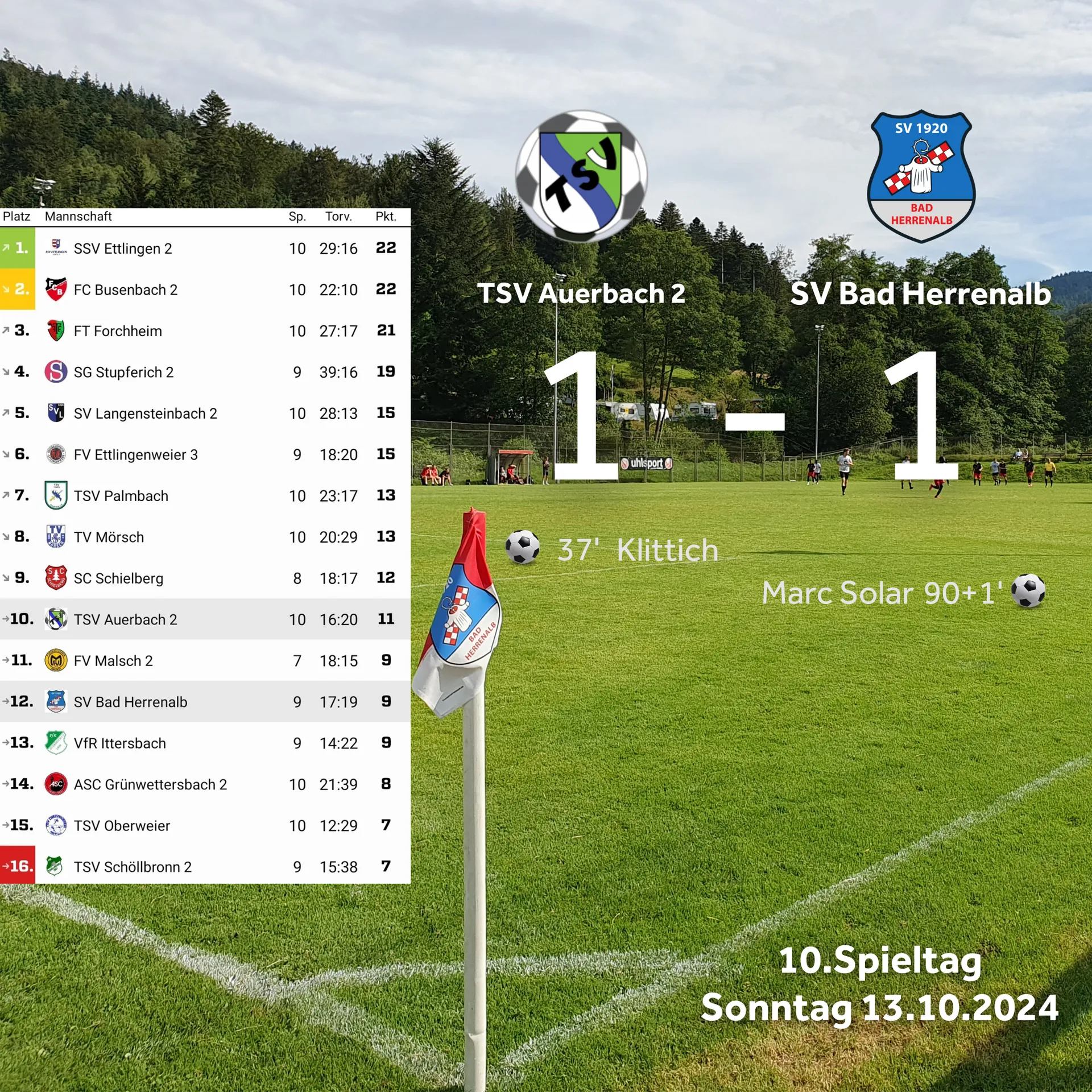 Da der Rasen in Herrenalb wegen des anhaltenden Regens unbespielbar war, wurde das Spiel der Zweiten gegen Rüppurr verlegt (Heimrechttausch nicht möglich, da Plätze der SG gerade neu gemacht werden). Beim Spiel der Ersten gegen Auerbach wurde mit dankendem Entgegenkommen der eigentlichen Gäste kurzerhand das Heimrecht getauscht. So fand das Hinspiel am Sonntag in Auerbach statt und wir sehen uns dann an der Schwimmbadstraße in der Rückrunde wieder. Das Spiel begann mit viel Ballbesitz für unser Team, welches diesen auch vom Gastgeber gerne überlassen bekam. Leider fehlten uns Ideen und wir setzten auch einstudierte Laufwege und unsere Spielidee nicht um, sodass sich ein ereignisarmes Spiel entwickelte. Wirklich gefährlich konnten wir nur bei Aufbaufehlern der Auerbacher werden. In Minute 37 kam Auerbach vor unser Tor, was wir zur Ecke klärten. Leider bleiben Ecken unser Kryptonit, denn erneut fiel das 1:0 in Folge einer Ecke, dieses Mal durch eine Verlängerung per Kopf zum langen Pfosten, wo ein Auerbacher Spieler frei stand und den Ball einköpfte. Mit diesem 1:0 ging es in die Pause, wo Trainer Adomat das Team versuchte wachzurütteln.