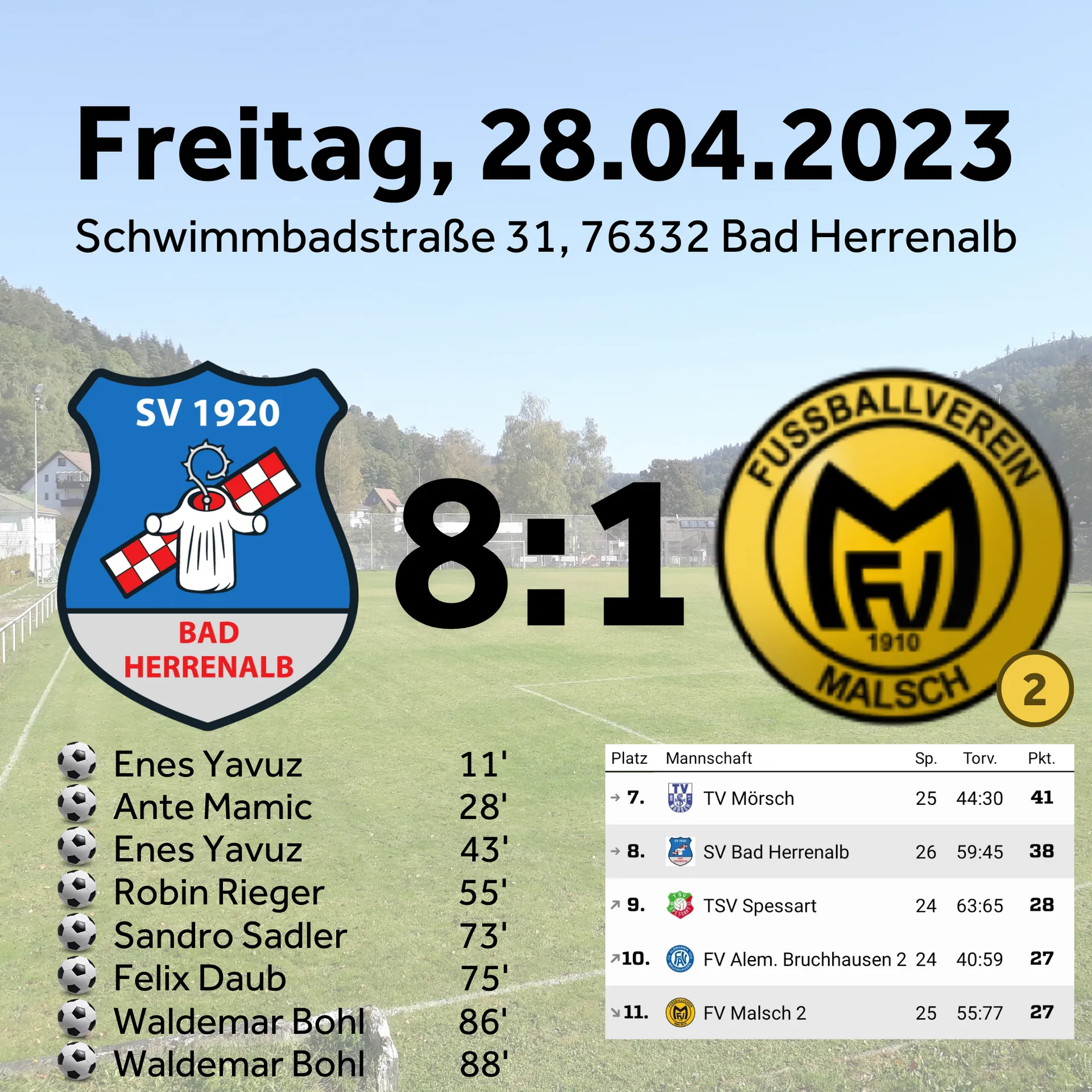 Der Torvorsprung tat gut, aber es ging weiter. In der 55. Min. flankte Sadler von links ins Zentrum auf den perfekt stehenden Rieger, dieser verwandelte zum 4:0. Auch der FV Malsch II hatte seine Chancen, eine nutzten sie zum 4:1 in der 64. Spielminute. Dies brachte aber die Elf von Adomat nicht aus der Spielruhe und es ging weiter nach vorne, sodass auch Distanzschüsse ausprobiert wurden. Mit Erfolg, denn Sadler schoss aus 20 Metern den SVH in der 73. Min. zum 5:1. Das Spiel war entschieden, der FV Malsch II hatte nichts mehr dagegenzusetzen. Unser Elf wollte nicht aufhören, man hätte meinen können, sie schossen sich heute den Frust der letzten verlorenen Spielen von der Seele. Einen Freistoß am 16 Metereck zirkelte Sadler auf den im Strafraum einlaufenden Daub, der per Kopf zum 6:1 erhöhte (75. Min.). Auch die neu eingewechselten Spieler hatten Lust und es ging nun nur noch in eine Richtung. So kam durch einen schön rausgespielten Spielzug über die rechte Seite Bohl zu seinem heutigen ersten Tor in der 86. Min. zum 7:1. Das anschließende Abstauber Tor zum 8:1 (88. Min.) von Bohl entstand durch einen Fehler vom Torwart des FV Malsch II. Dies war ein wichtiger Sieg und 3 Punkte, nicht nur für die Tabelle sondern auch für unsere Spieler. Weiter so Jungs!!