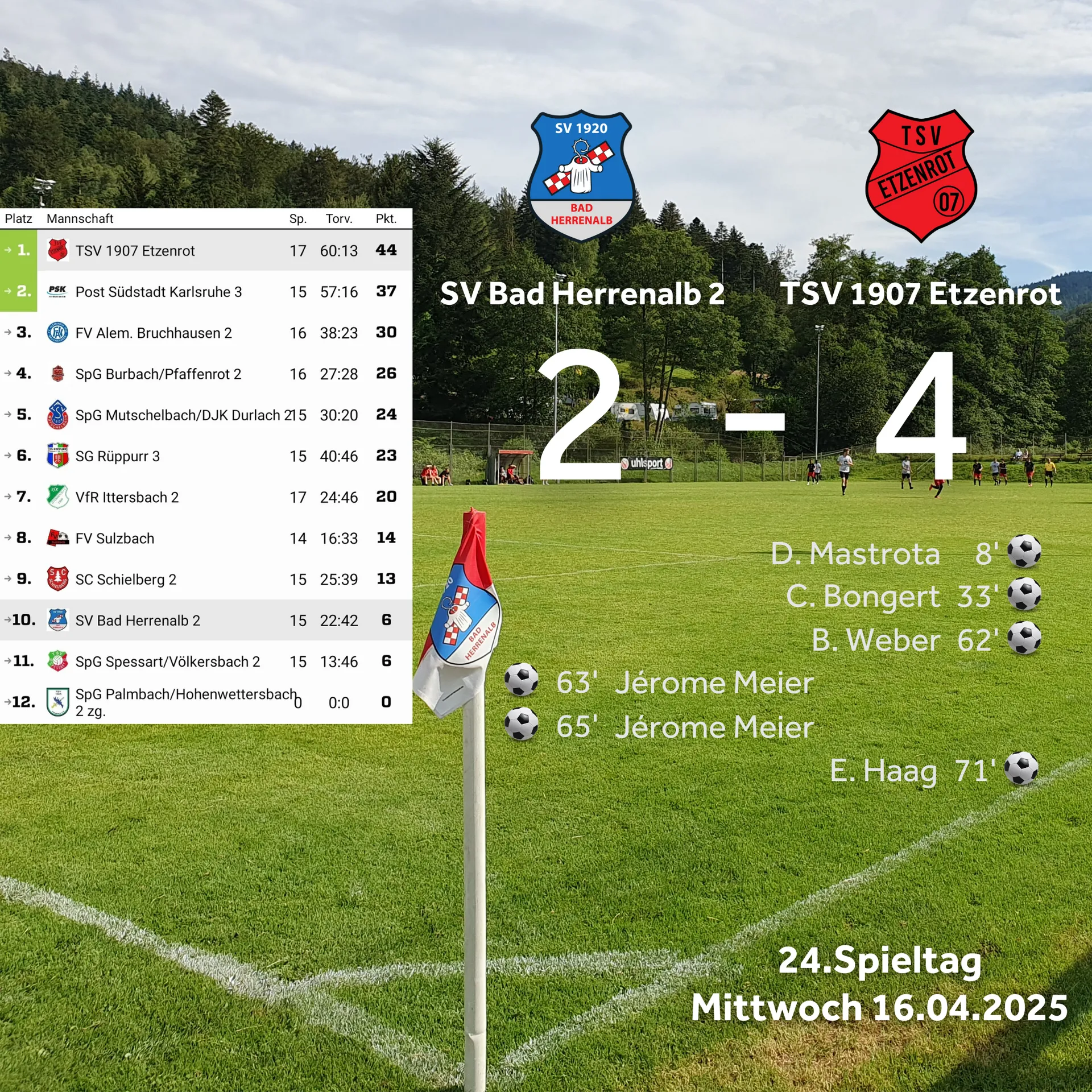 Auch in der zweiten Hälfte hatte Etzenrot mehr vom Spiel, blieb jedoch bei der gleichen Taktik, die wir besser verteidigten. Dennoch gelang nach einem scharfen Pass das 0:3 (62′), ehe wir uns berappelten. Ein Diagonalball von Weiß auf Halilaj ins linke Mittelfeld trieb dieser gegen hoch stehende Gäste bis zur Sechzehnerkante, von wo er den Ball aufs Tor schoss. Meier grätsche vor dem Torhüter in den Ball und drückte ihn so über die Linie. Eine schöne Co-Produktion unserer Torhüter. Kurz darauf jubelte erneut Meier, als er den 2:3 Anschluss erzielte, was die Etzenroter Spieler und auch deren Bank zum Schwitzen brachte. Fünf Minuten später stellte Etzenrot jedoch per direkt verwandeltem Freistoß auf 2:4, was auch den Endstand bedeutete. Wir gratulieren den Gästen zum Aufstieg und können uns nicht vorwerfen lassen, wir hätten es ihnen leicht gemacht.