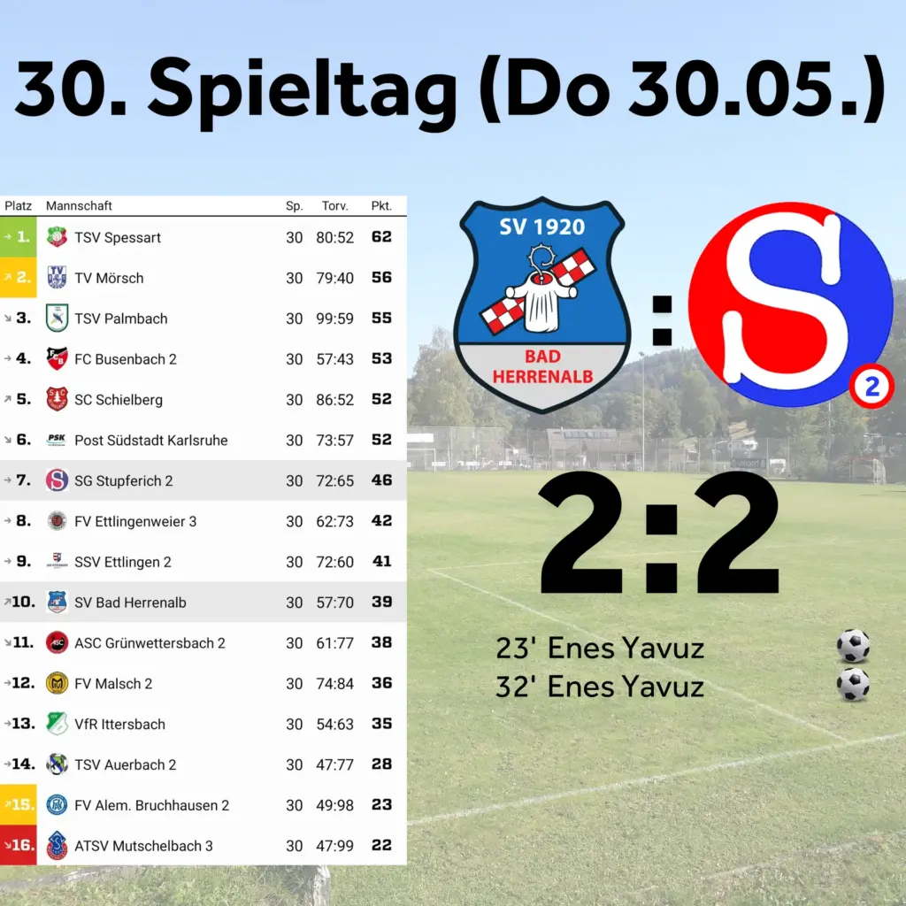 Die Zweite spielte ihr letztes Saisonspiel am 30.05. zu Hause gegen Schlusslicht FV Sulzbach, die am Spieltag zuvor ihre ersten Punkte einfuhren und somit die punktlose Saison abwenden konnten. Obwohl es in diesem Spiel tabellarisch um nichts mehr ging, entwickelte sich ein munterer Kick, bei dem wir durch einen Treffer des ehemaligen Sulzbachers S.Hartwich in Minute 24 verdient in Führung gingen. Leider nutzte Sulzbach kurz darauf die einzig gute Chance der ersten Hälfte, um zum 1:1 Ausgleich zu treffen (32`). Trotzt mehrerer Torabschlüsse unsererseits blieb es beim 1:1 Pausenstand.