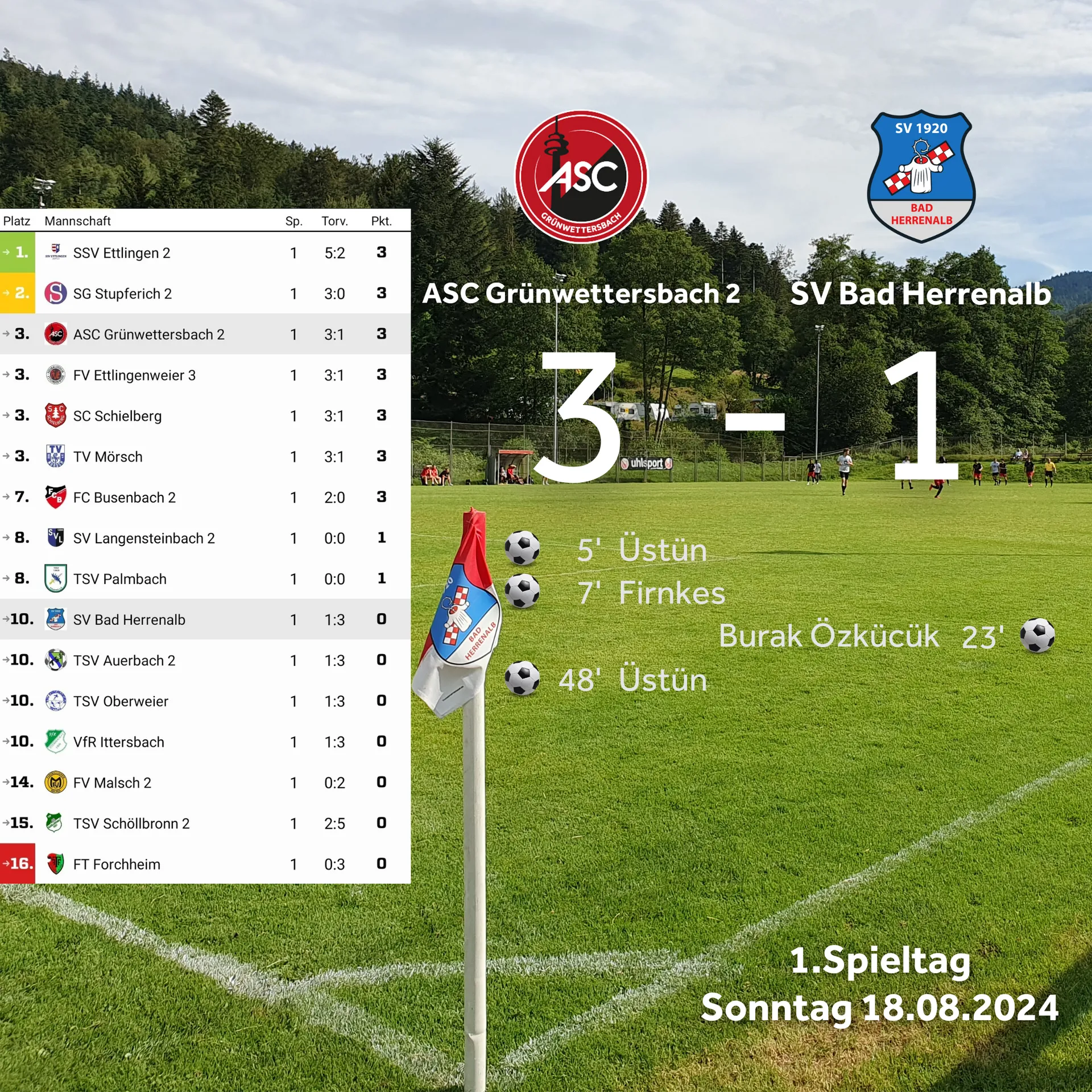 Die Jungs von Trainer Adomat und A.Weiß hatten sich viel vorgenommen und wollten nach positiven Testspielen auch gut in die Saison starten. Leider machten die Kicker des ASC Grünwettersbach dies schnell schwer, denn durch einen Doppelschlag stand es früh 2:0 (5`, 7`). Hier war jeweils nichts zu halten, aber äußerst unglücklich, wenn aus zwei Torschüssen gleich der frühe Rückstand resultiert. Die Jungs steckten jedoch nicht auf und kämpften sich in die Partie. In Minute 23 trat Özkücük zum Freistoß an und schoss diesen scharf aufs Tor. Der Torhüter war davon wohl etwas überrascht und konnte ihn nicht abwehren, sodass wir den Anschluss bejubelten. Leider war uns der Ausgleich bis zur Pause nicht mehr vergönnt. Dies nahmen wir uns jedoch für Halbzeit zwei vor und gingen motiviert aufs Feld.