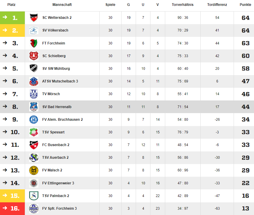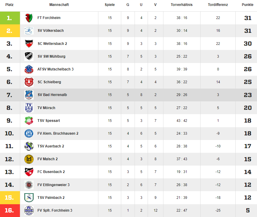 In die Runde starteten wir mir zwei unglücklichen Remis, darunter auch ein 1:1 gegen den späteren Aufsteiger SV Völkersbach. Am dritten Spieltag fügten uns die FT Forchheim (Herbstmeister und später Aufstiegsrelegation) mit 1:4 die erste Niederlage zu, was nur eine Woche später die zu Saisonbeginn starken und lange an der Spitze stehenden Mutschelbacher mit 5:2 wiederholten. So dauerte es bis zum 5. Spieltag, dass wir unseren ersten Dreier gegen Auerbach einfuhren. Es folgten bis zu Winterpause sechs weitere, meist sehr unglückliche Unentschieden (unter anderem ein 1:1 gegen den späteren Meister Wettersbach), sowie vier Siege. Hiervon war sicher das 2:1 gegen den Nachbarn aus Schielberg besonders erwähnenswert. Zusammenfassend wurden wir in der Hinrunde zwar nur zweimal geschlagen, mussten aber bei nur fünf Siegen ganze achtmal die Punkte teilen, was leider nur für Platz 7 reichte. Es wurden schlicht zu viele Punkte gegen Teams aus der unteren Tabellenhälfte liegen gelassen (Palmbach, Ettlingenweier, Busenbach jeweils unentschieden). Die Sommerabgänge unserer Torjäger Alzubani und Rieger konnten wir nicht kompensieren und liesen wegen mangelnder Erfahrung und Kaltschnäuzigkeit zu viele Tore liegen. Daher war es umso erfreulicher, dass beide Spieler im Winter wieder den Weg in ihre fussballerische Heimat fanden.