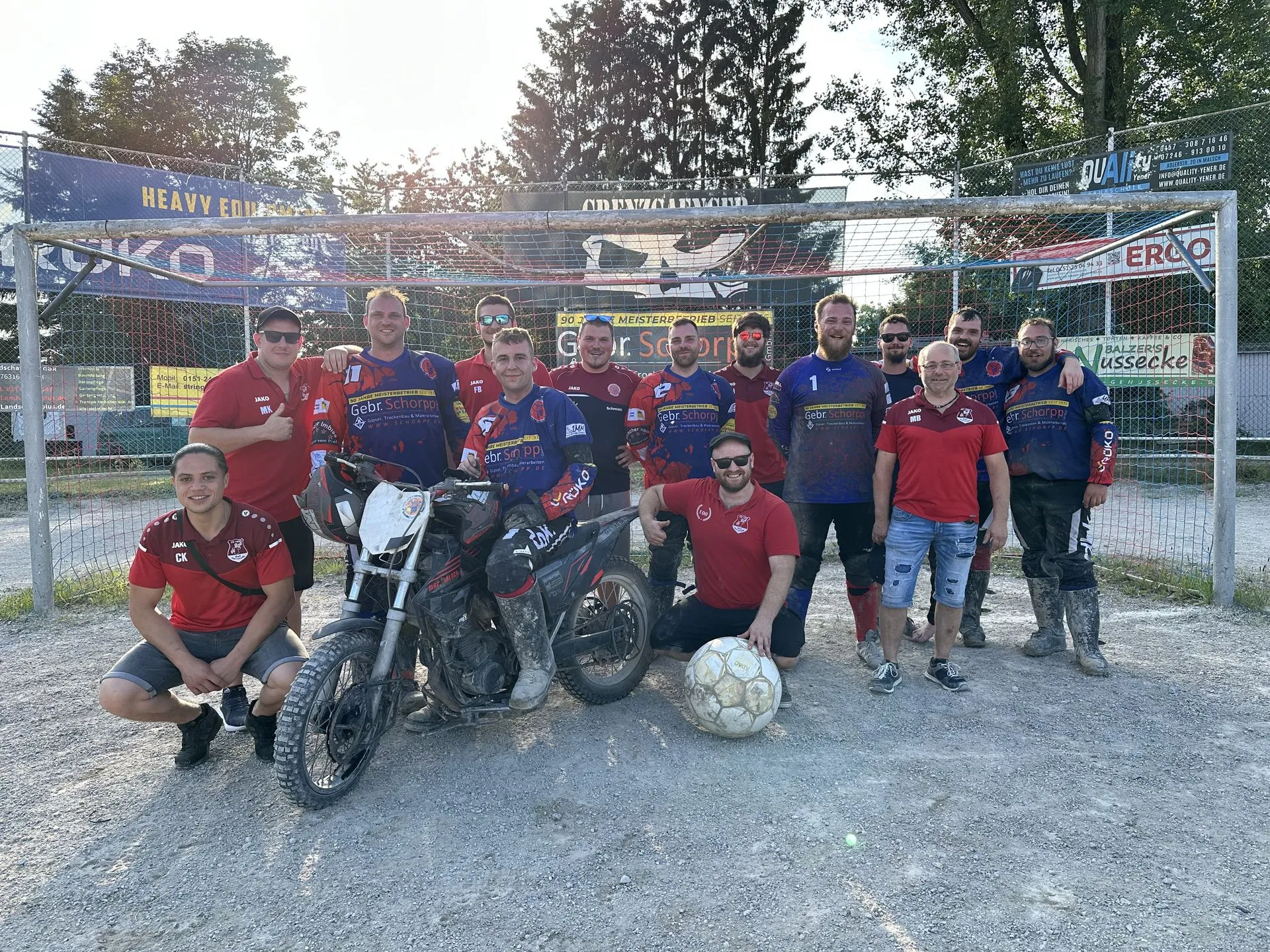 Aktuell befindet sich unsere Herrenmannschaft in der Sommerpause. Doch so ganz ohne Ball geht das nicht bei allen. Am Samstag, 14.06.2025, war eine kleine Delegation des SV Bad Herrenalb zu Gast beim Motoballspiel des MSC Malsch. Besonders spannend war, dass der ehemalige Torwart des SVH, Rene Bischoff, nun zwischen den Pfosten des MSC steht und sich hier einem größeren Ball gegenübersieht. Das Ereignis war beeindruckend. Es herrschte Höllenlärm und es gab hitzige Duelle, bei denen die motorisierten Bikes auf dem Schotterplatz viel Staub aufwirbelten. Trotz des verlorenen Spiels seitens des MSC, war die Stimmung nicht getrübt und es blieb ein aufregender Ausflug für alle Anwesenden. Der SVH bedankt sich herzlich für die Einladung und freut sich bereits auf einen Gegenbesuch des MSC auf unserem Rasen.
