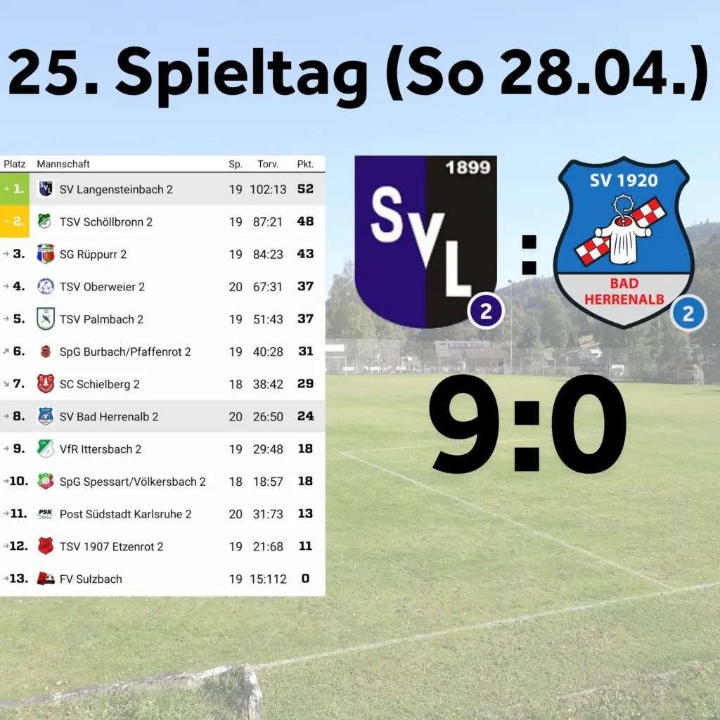 Bedingt durch Ausfälle in der Ersten, aber auch fehlende Zweitemannschaft-Spieler fuhren wir mit inaktiven Spielern zu den Tabellenführern nach Langensteinbach. Bereits früh duschten diese uns mit dem 1:0 (4`), bis wir etwas ins Spiel fanden. Über die gesamte Spielzeit waren die Meisteraspiranten tonangebend und wir im Verteidigungsmodus. Bis zur Pause mussten wir noch das 2:0 (25`) und 3:0 (31`) hinnehmen. Das zu laufen von Lücken und hinterherlaufen der Spielverlagerung der Gastgeber forderte konditionell bei uns Tribut, sodass wir wechseln mussten und zunehmend klassisch den „Schritt zu spät“ kamen. So schraubten die Hausherren das Ergebnis noch auf 9:0 (53`, 60`, 73`, 75`, 85`, 88`). In der Höhe sehr deutlich, aber wir hielten mit den uns heute zur Verfügung stehenden Mitteln gegen die stark aufspielenden Langensteinbacher trotzdem bis zum Abpfiff dagegen und wollten uns trotz der vielen Gegentore und schwindenden Kräften nicht völlig aufgeben.