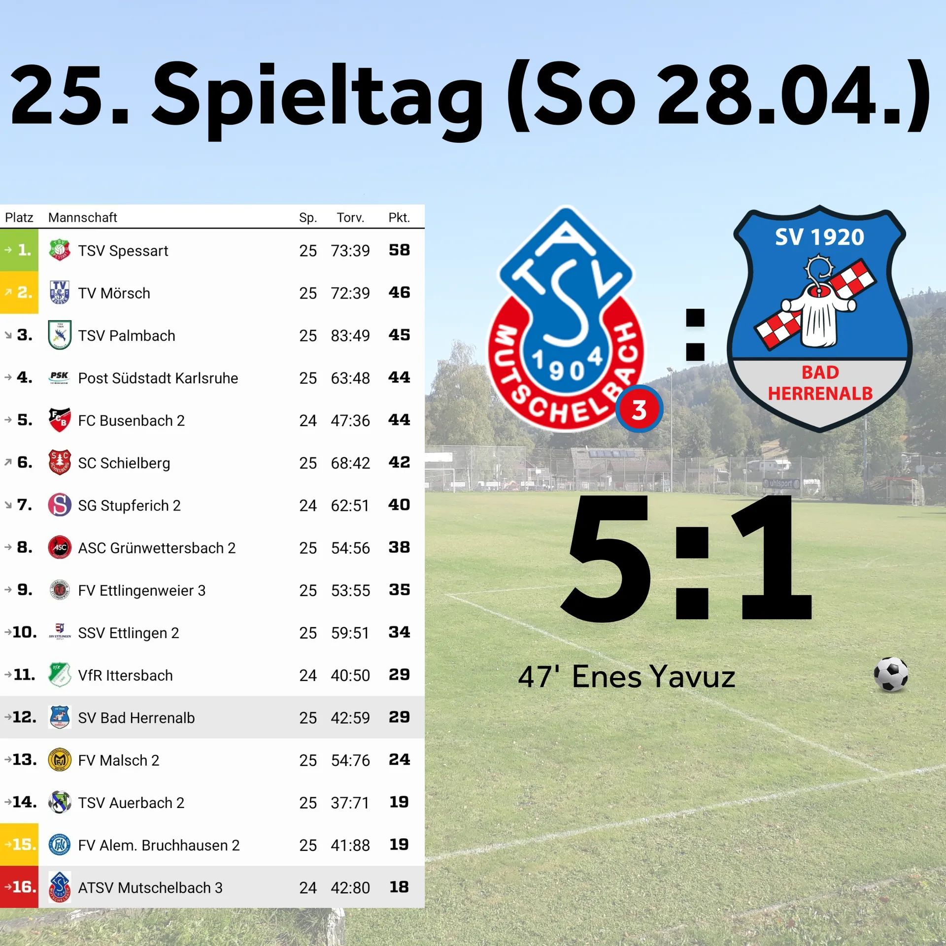 Wir hielten zunächst trotz des Schocks des kurzfristigen Ausfalls gut mit, mussten aber mit einem 1:0 (37`) Rückstand in die Pause. Aus dieser kamen wir mit Schwung und Yavuz erzielte schnell das 1:1 (47`), als er einen Fehler zwischen Torhüter und Innenverteidiger nutzte, um ins leere Tor einzuschieben. Anstatt hiervon motiviert auf das 1:2 zu spielen, schlichen sich nun Fehler ein. Amjoune verlor trotz freier Mitspieler den Ball am eigenen Sechzehner. Da P.Cattiez als Anspielstation neben dem Tor stand, schlenzte der Spieler den Ball ins lange Eck 2:1 (56`). Das 3:1 (77`) fiel nach klarer Abseitsposition, ehe der Landesliga-Stürmer der Gastgeber jeweils den Pass von Mamic im Aufbauspiel erahnte, den Ball erlief und zum 4:1 (80`) und 5:1 (82`) einschob. In Summe machten zwar die Landesligaspieler den Unterschied (4 Tore), aber bei uns häuften sich in der zweiten Hälfte auch kleine Fehler, mit denen wir Mutschelbach zu Toren einluden.