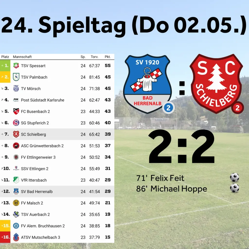 Vor zwei Wochen konnte das „kleine Derby“ wegen anhaltendem Regen nicht gespielt werden. So stand am Donnerstag nach dem 1.Mai das Nachholspiel bei Flutlicht auf dem Programm. In der ersten Halbzeit egalisierten sich die Mannschaften in einem umkämpften Spiel und es gab nur vereinzelte Chancen auf beiden Seiten. Nach der Pause spielte sich das Geschehen weiterhin zwischen den beiden Abwehrreihen ab, jedoch suchten beide Mannschaften nun öfter den Abschluss. Durch den Regen war der Platz rutschig, die Bälle wurden sehr schnell und unberechenbarer. Den Dosenöffner hatte Feit, der zur Pause für Schlager eingewechselt wurde. Seinen Schuss aus 25 Metern schlenzte er um den Verteidiger und unhaltbar für den Torhüter zum 1:0 (71`) ins lange Eck. Kurz darauf gab es Freistoß vor unserem Sechzehner. Halilaj schlug diesen halbhoch auf den langen Pfosten, wo Prax ihn aufnehmen wollte. Doch der Ball sprang kurz vor ihm auf und statt wieder hochzuspringen rutschte er auf dem nassen Rasen flach zum 1:1 (79`) über die Linie – keine Chance für Prax. Schielberg hatte durch den Ausgleich Rückenwind und suchte auch weiter mit Fernschüssen ihr Glück. Einen solchen drosch Rensch von halblinks hoch aufs Tor und über die Unterkante der Latte zum 1:2 (84`) hinter die Linie. Doch unsere Zweite wollte dieses Spiel auf keinen Fall verlieren und kämpfte weiter für den Ausgleich. Nahezu unmittelbar nach dem 1:2 fasste Hoppe sich ein Herz und zirkelte den Ball bei einem Freistoß von der Sechzehnerkante zum verdienten 2:2 (86`) in den Torwinkel. Wir versuchten auch noch das Spiel zu drehen, es blieb jedoch beim 2:2, welches in Summe verdient war, mit leichter Feldüberlegenheit unsererseits. Beide Teams und ihre Anhänger liesen den Abend gemeinsam im Sportheim ausklingen.