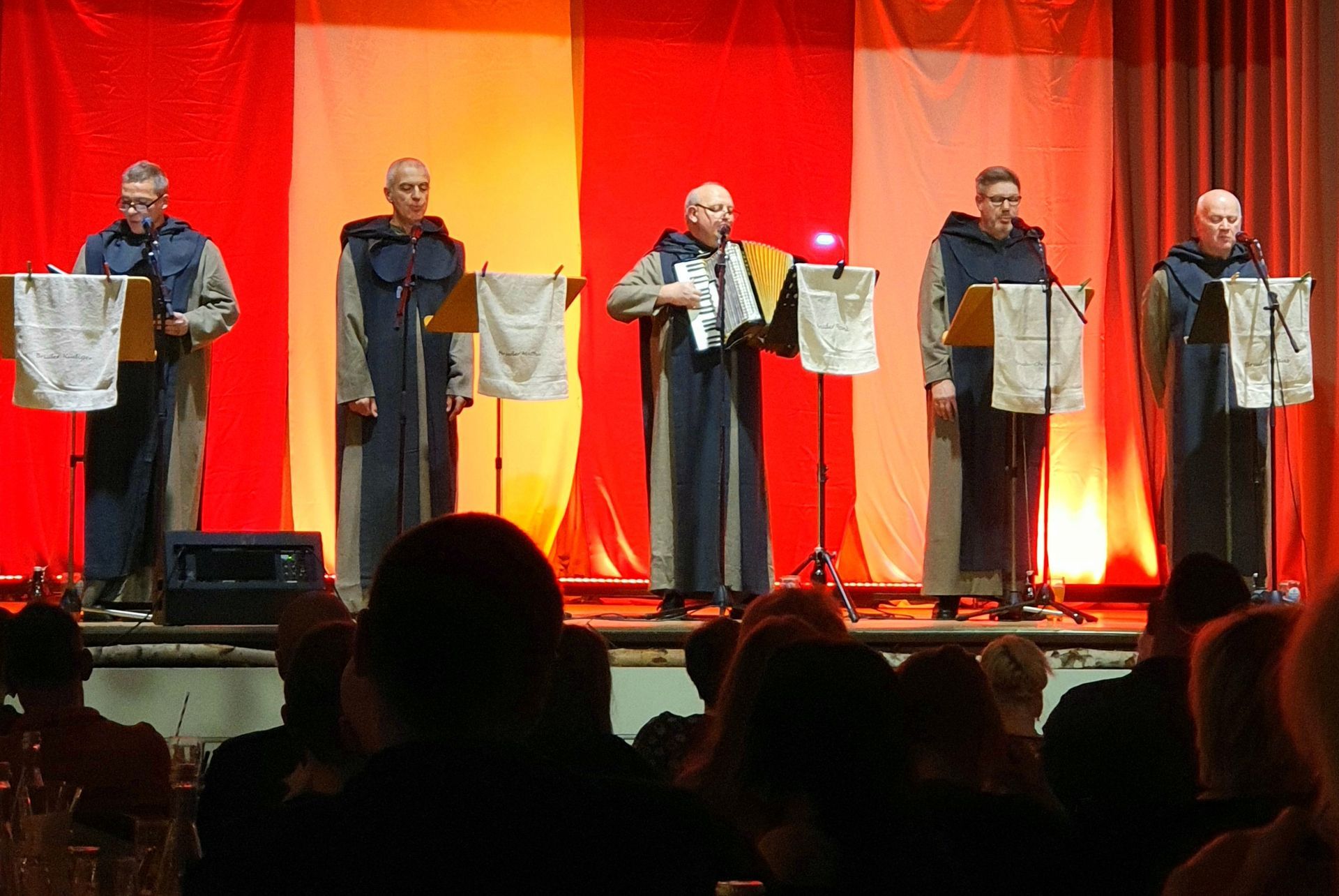 Nach einer kurzen Umbaupause führten Andi und Andi gewohnt unterhaltsam durchs Programm. Zunächst durften die Alten Herren ihr Schauspielkönnen zeigen beim Märchen „Schneewittchen und die sieben Zwerge – Was danach geschah“. Es folgte der Auftritt unseres Spielers und Rapper Nicolai Zimmermann (Nyso), der seinen eigens für den SVH geschriebenen Song vortrug: „Der SVH – ist wieder da, wir spielen im Cage, wie jedes Jahr. Wir feiern hier – ja das ist klar. Der SVH, hurra, hurra“. Auch unsere Freunde der Freizeitkicker Bernbach ließen es sich nicht nehmen, unseren Abend wieder mit ihrer Hitparade zu bereichern. Es folgte die Band „Hartz 5“, die sich im Laufe des Abends in „Bürgergeld 8“ umbenannte und interpretierte bekannte Popsongs im Blasmusik-Style sowie mit Gesang. Besondere Ortsgeschehnisse wurden anschließend vom Klostergericht (Titelbild) humorvoll in Versform auf die Schippe genommen. Zum ersten Mal dabei war die neu gegründete Damenmannschaft, die in leuchtenden Anzügen einen anspruchsvollen und tollen Tanz zeigte. Den stimmungsvollen Abschluss des Abends machte die Hitparade der Aktivität, welche von unserem vereinseigenen „Thomas Gottschalk“ moderiert wurde. Der Tanz der aktiven Spieler, brachte die Stimmung im Publikum nicht nur tänzerisch, sondern auch durch den Wegfall einiger Kleidungsstücke zum kochen. Den Abschluss der Hitparade gab ein gemeinsamer Auftritt aller Akteure des Abends. Der Applaus der Zuschauer entschädigte für die vielen Stunden des Probens und der Vorbereitung. Nochmals ein großer Dank an alle Akteure, Helfer und Sponsoren!