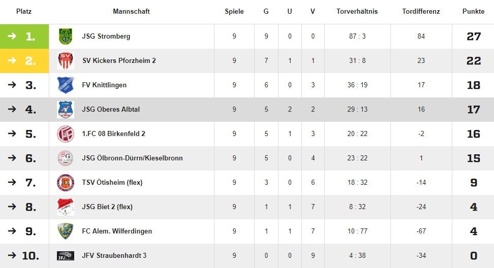 Im letzten Vorrundenspiel gewannen die C-Junioren mit 3:1 bei der C3 der JFV Straubenhardt. Dies war gleichzeitig der 5.Saisonsieg im 9.Spiel. Damit belegen die von Oliver Schmidt, Marcel Breithaupt und Markus Federmann trainierten C-Junioren mit 17 Punkten einen sehr guten 4.Tabellenplatz bei 10 Mannschaften mit einem Torverhältnis von 29:13 (siehe Tabelle). Diese Zahlen dienen aber nur statischen Zwecken, denn viel wichtiger ist das Erreichen eines hervorragenden Teamgeistes in der Spielgemeinschaft und dass die jungen Spieler Spaß am Fußball haben.