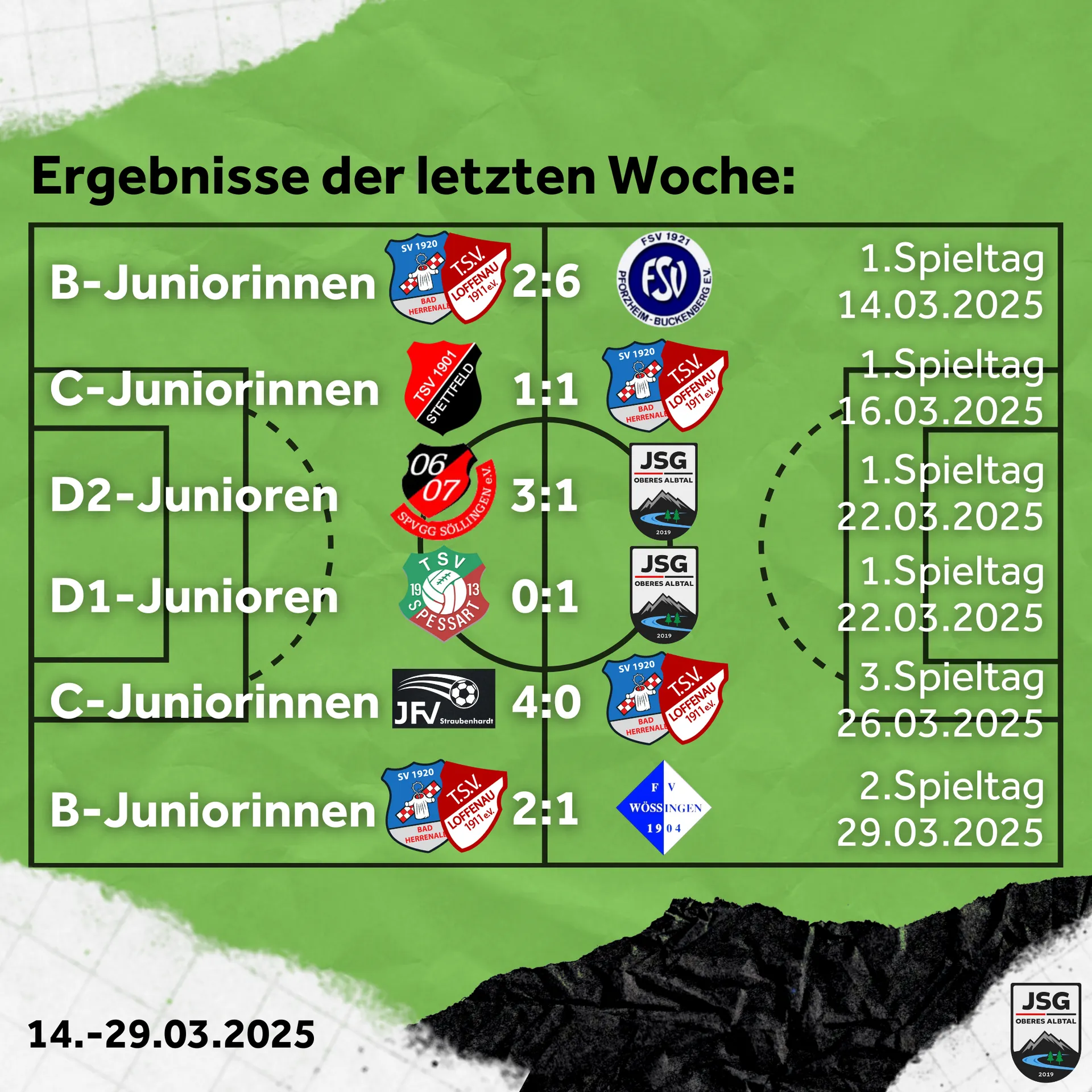 In der Pause stellten wir taktisch um, um das Zentrum besser zu besetzen und sprachen den Mädels Mut zu, mehr Einsatz und Konzentration zu zeigen. Dies setzten sie auch sehr gut um. Defensiv liesen Maya, Amal und Amina nichts mehr zu, während wir durch eine sehr laufstarke und spielfreudige Offensive um Suela, Lea und Laura zu eigenen Chancen kamen, die wir leider knapp vergaben. Wäre hier ein Ball reingegangen, hätte dies der Mannschaft sicher nochmals einen Ruck gegeben und es wäre spannend geworden. So bleibt eine unglückliche Niederlage aber eine zweite Hälfte, die viel Mut macht.B-Juniorinnen – JSG Walzbachtal 2:1 (1:1)
