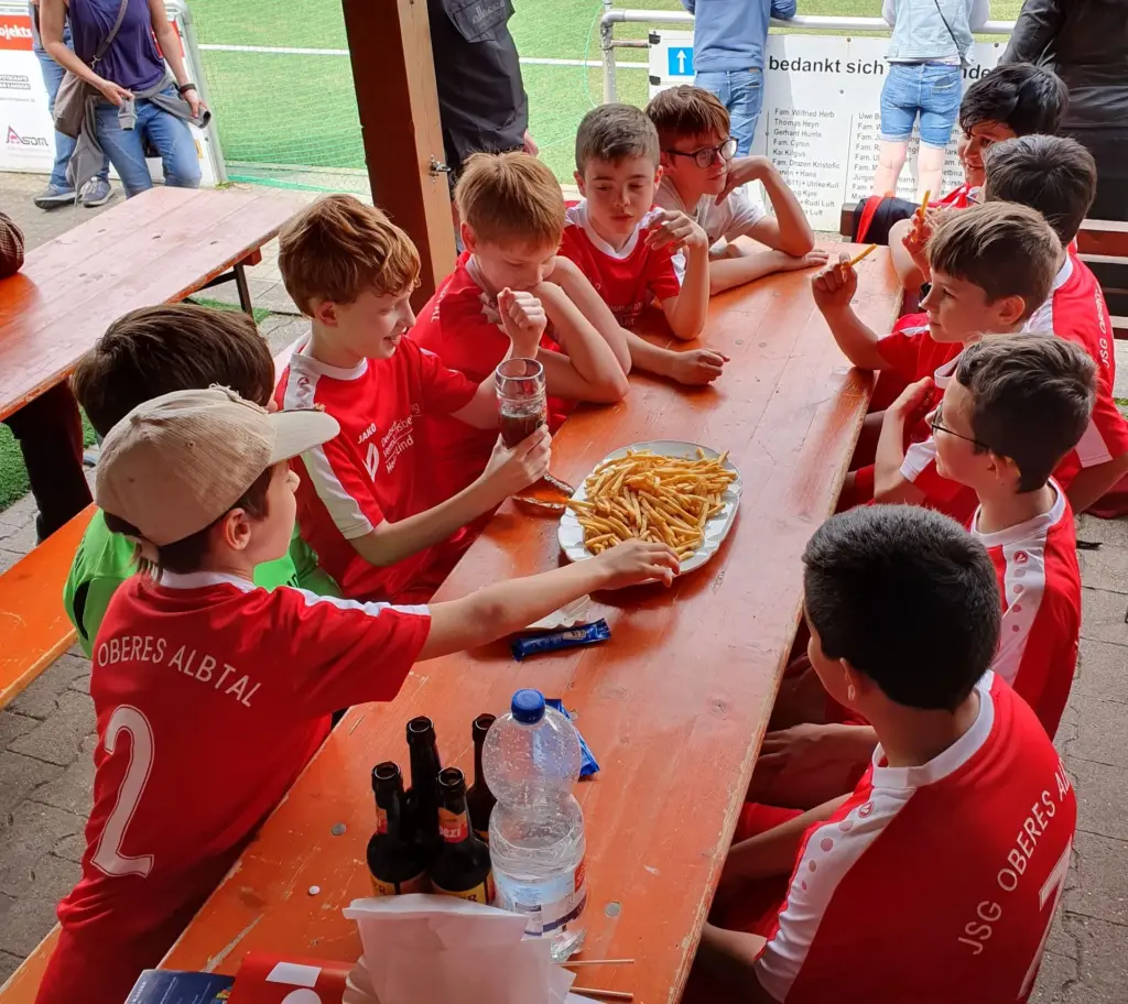 Dementsprechend versuchten wir im letzten Spiel etwas defensiver gegen die zahlreich von der TSG Hoffenheim verstärkte Truppe zu agieren. Leider kamen wir neben der spielerischen Überlegenheit auch mit dem sehr robusten Körpereinsatz und den versteckten Fouls der Gegner nicht zurecht, weil wir dies von der Faiplay-Liga im badischen Fußballkreis gewohnt sind, dass die Teams die Spiele mit klarer Fairnessbrille bestreiten. Somit war auch der erlaubte Körpereinsatz und das „nerven“ der Gegner eine neue Erfahrung für unsere Spieler, auch wenn die Spieler der SpVgg Oberrad sich hier mehrfach über der Grenze des erlaubten bewegten. Am Ende stand ein klares 0:8 und viele Fragen der Spieler ans Trainerteam zum rauen Spiel der letzten Gegner. Nach deren Klärung gab es auf diese klare Niederlage und zur Aufmunterung der enttäuschten Spieler im Anschluss Pommes und einen Spezi-Stiefel, um die Motivation für das Platzierungsspiel wieder hoch zu fahren.