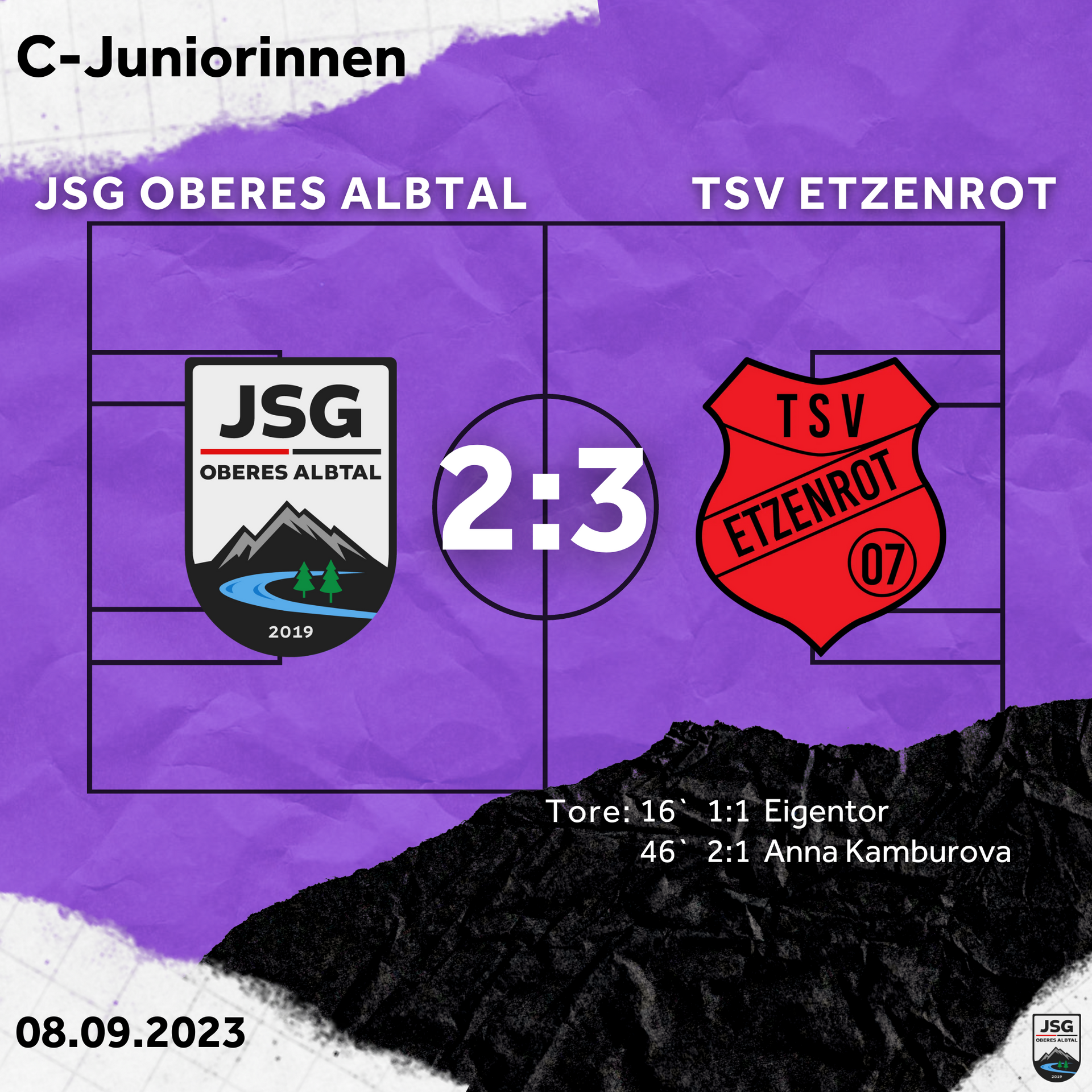 Das letzte Drittel begannen wir druckvoller. Lena, jetzt auf dem Flügel, und Sumeja in der Spitze sorgten für Unordnung bei den Gästen, welche Anna-Maria zum 2:1 Führungstreffer nutze. Durch eine Lücke der Abwehr fand ihr Schuss aus zweiter Reihe etwas glücklich aber verdient den Weg ins Tor. Wir versuchten die Etzenroter nun weiter von unserem Tor fern zu halten und liefen sie früh an. Die neu formierte Abwehr aus Suela-Saskia-Lea klärte weiter alle Angriffsversuche souverän. Leider fand dann, nahezu identisch wie unser Führungstreffer, ein Schuss aus zweiter Reihe etwas unglücklich sein Ziel zum 2:2 Ausgleich. Die Gäste wollten nun unbedingt den Sieg und störten uns bereits sehr früh im Spielaufbau, was zur ein oder anderen brenzligen Situation führte. Hier konnte sich Selina erneut mit einem starken Reflex auszeichnen und hielt das 2:2 fest. Man merkte, dass die Gäste drei Wechselspieler mehr dabei hatten und so vielleicht auch noch etwas mehr Kraft hatten – denn diese lies nun bei allen zusehend nach. Als sich fast alle schon mit dem 2:2 zufrieden gaben, nutzten die Gäste einen Fehlpass im Spielaufbau aus, um den Ball dann alleine vor Selina zum spielentscheidenden 2:3 ins Tor zu schießen.
