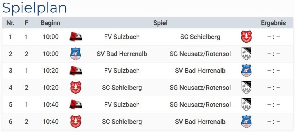 Nach krankheitsbedingten Absagen des FVA Bruchhausen und des TSV Spessart am Vortag, konnten wir am Samstag nur den FV Sulzbach mit einem Rumpfkader begrüßen. Hier kam uns unser aktuell starker Zulauf (über 25 F-Junioren im Training) zu Gute und wir konnten mit 19 eigenen Kindern und den vier Kindern aus Sulzbache vier Teams bildenund unterstützten den FV Sulzbach mit zwei „Leihspielern“.Diese spielten dann jeder-gegen-jeden bei diesem „Improvisations-Spieltag“. Wichtig war es, dass die Kids Spielpraxis sammeln und Spaß am Kicken haben, was allen Anwesenden anzusehen war. Um die Übersichtlichkeit bei drei eigenen Teams zu wahren, gingen die Teams unter den Vereinsnamen unserer JSG Vereine „SV Bad Herrenalb“, „SC Schielberg“ und „SG Neusatz/Rotensol“ an den Start – sorry nach Bernbach, für vier eigene Teams reichte es heute leider nicht ;-). Ein großer Dank geht nach Sulzbach, die trotz Personalmangel und schlechtem Wetter die weite Anreise antraten und diesen „Improvisations-Spieltag“ mit uns gestalteten.