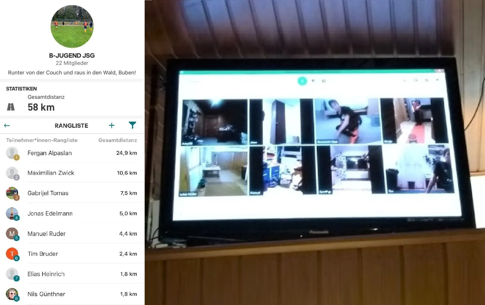 Die B-Junioren haben als „Hausaufgabe“ von ihrem Trainerteam bekommen mindestens 15 km Waldlauf pro Woche zu absolvieren. Zur Nachverfolgung der Trainingsleistung zeichnet eine Lauf-App die Kilometer auf und zeigt die gelaufenen Kilometer jedes Mitspielers in einer Übersicht an. Damit sehen die Spieler direkt, wo sie im Team-Vergleich stehen und werden dadurch motiviert mehr zu Laufen, denn das Trainerteam hat neben Belohnungen für die besten Läufer auf „Straftraining“ für Laufmuffel ausgegeben. So trainiert zwar jeder für sich, der Ansporn, am Ende der Woche nicht am Ende der Tabelle zu stehen motiviert jedoch jeden und hält den Kontakt zum Team.Die C-Jugend geht einen anderen Weg: Online-Training heißt hier das Stichwort. Dienstags und donnerstags gehen die Spieler und Spielerinnen nicht wie gewohnt in Kickschuhen auf den Sportplatz, sondern in Sportklamotten vor den Laptop oder das Handy. Denn pünktlich um 19 Uhr beginnt das Online-Training. Während Trainer Lukas die Übungen mit einfachen und alltäglichen Hilfsmitteln vormacht, macht jeder Spieler diese im heimischen Zimmer nach. Dank der Videofunktion können auch Korrekturen an der Übungsausführung vorgenommen, Rückfragen gestellt und die Übungen gut vorgemacht werden. Auch für den ein oder anderen Austausch ist dabei natürlich Platz und jeder sieht seine Teamkollegen, wenn auch nur am Bildschirm, weiterhin zweimal pro Woche für 45 Minuten. Als kleiner Nebeneffekt freuen sich die Eltern über aufgeräumte Zimmer, denn keiner möchte seiner Mannschaft ein unordentliches Zimmer präsentieren.