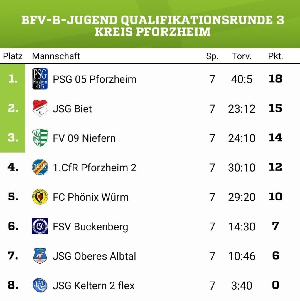 So starteten wir mit dem wohl jüngsten Kader der Staffel gleich gegen den ausschließlich mit 2007er besetzten späteren Meister PSG Pforzheim mit 0:11. Dann kamen Verletzungen und eine Krankheitswelle dazu und wir verloren auch das zweite Spiel gegen Phönix Würm deutlich mit 1:13. Es folgten Siege gegen FSV Buckenberg, JSG Keltern 2 und JSG Platte, wobei letztere ihr Team mangels Spielern während der Runde abmeldeten, weshalb das Ergebnis nicht in die Abschlusstabelle einfloss. Die Niederlage gegen die JSG Biet fiel mit 2:7 gemessen am Spielverlauf sehr unglücklich und zu deutlich aus. Zum letzten Saisonspiel gegen den CFR musste man wegen vieler Ausfälle nur mit einem Ersatzspieler und vielen jüngeren Spielern fahren, weshalb die Hinrunde mit einem deutlichen 0:9 beendet wurde.