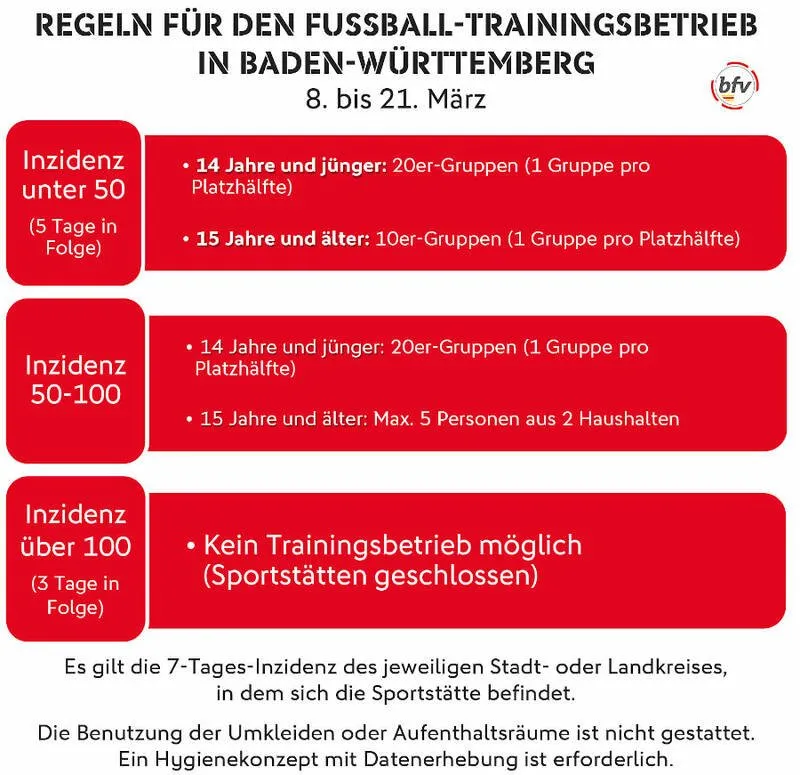 Die Bundesregierung stellte Ende vergangener Wochen die Weichen und die Landkreise zogen nach. Am Montag veröffentlichte der Landkreis Calw eine Pressemitteilung, in welcher der Wert der 7-Tagesinzidenz „bereinigt“ wurde. Dadurch, dass das Infektionsgeschehen nicht mehr als „diffus“, sondern „klar abgrenzbar“ eingestuft wurde, konnte die bereinigte Inzidenz unter die 50er-Grenze korrigiert werden. Dies ermöglicht es, dass in allen Altersklassen Training mindestens in 10er Gruppen, bei den Altersklassen unter 15 Jahren sogar in 20er Gruppen durchzuführen. Dies bestätigte auch der badische Fußballverband. Wir als Vereine sind hierfür sehr dankbar, sind uns der Verantwortung die sich daraus für uns ergibt jedoch auch bewusst. Daher haben wir die Wiederaufnahme des Trainingsbetriebs gestaffelt und werden bei allen Trainingseinheiten darauf achten, dass Hygienemaßnahmen eingehalten und unnötige Kontakte vermieden werden. Ebenso behalten wir das Dashboard der Landkreise täglich im Blick, um bei einer Überschreitung des Grenzwerts den Trainingsbetrieb anzupassen oder gar wieder einzustellen. Wir hoffen nun, dass auch der Kreis Karlsruhe bald unter den Grenzwert von 50 kommt und auch auf dem Gelände des SC Schielberg die Jahrgänge der über 14 jährigen trainieren können.