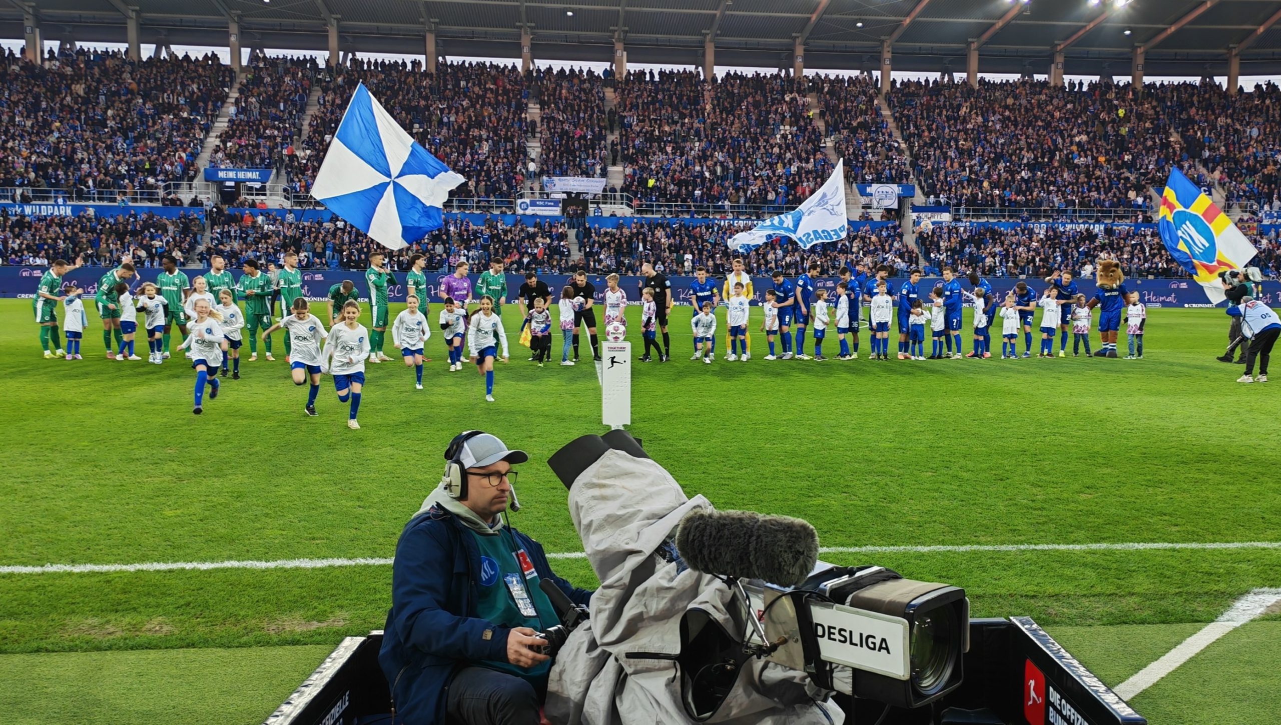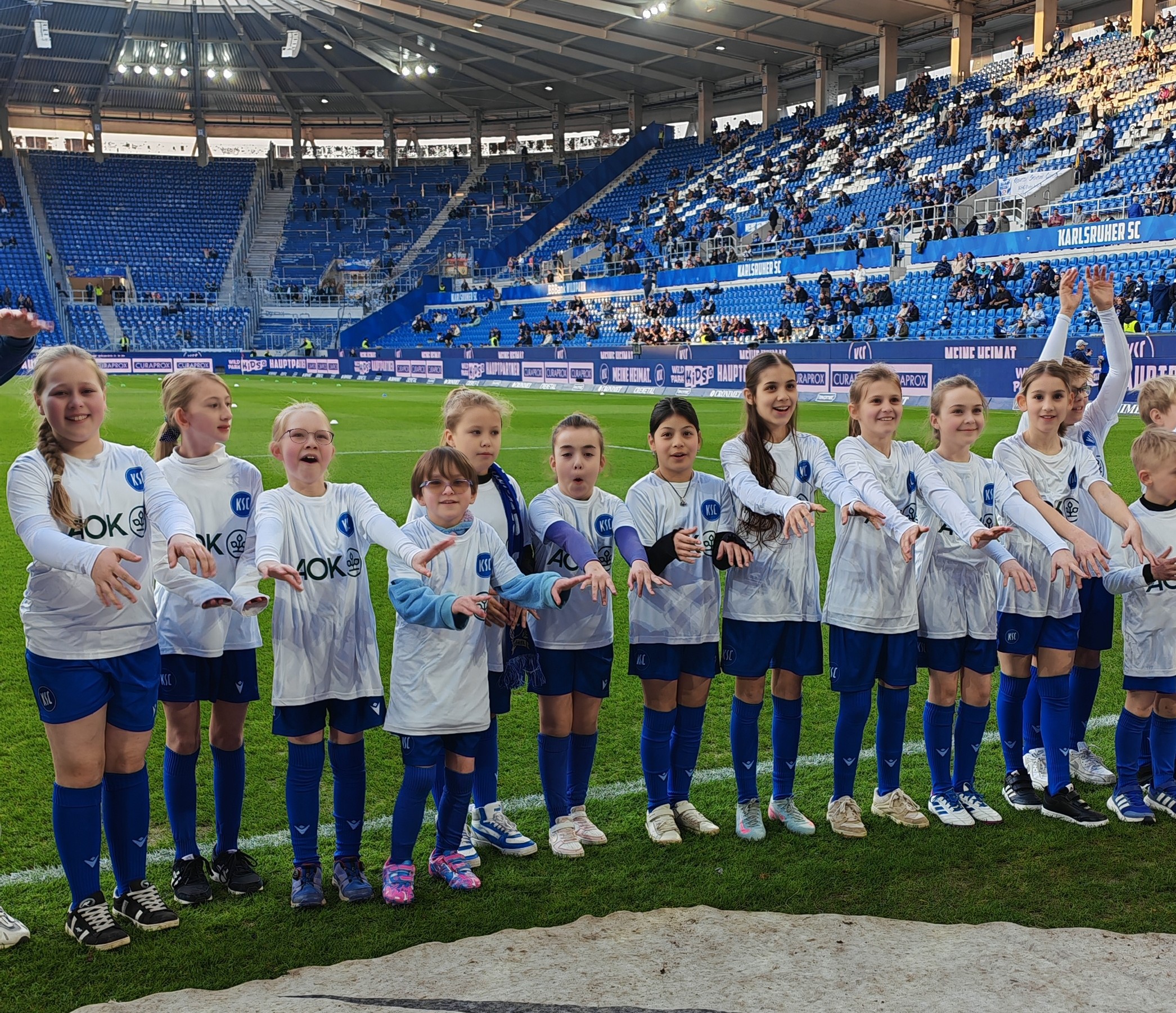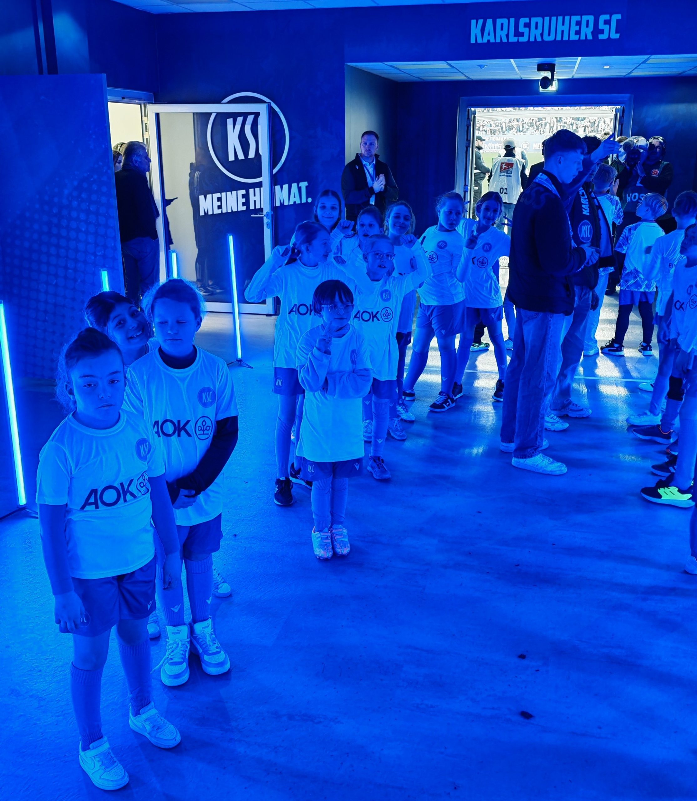 Umso größer war dann die Enttäuschung, als es vor Ort hieß: Die Mädels laufen mit den Gästen ein, die Jungs mit dem KSC. Der AOK-Betreuer vor Ort war heute auch vom Team der Jungs, weshalb hier wohl auch etwas Vitamin B aushalf. Nach kurzem Frust und Trauer beim Umziehen ging es in die Katakomben, wo die Augen wieder zu strahlen begannen. Es folgte eine Stadion-Runde mit „Laola-Stopp“ vor der voll besetzten Fankurve, wo die Mädels sich schon als Stimmungskanonen bewiesen.