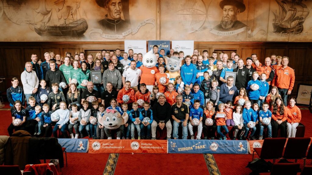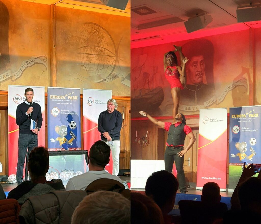 Der Einladung des badischen Fußballverbands für die Verleihung des Preises lagen fünf Freikarten für den Besuch des Europa-Parks an diesem Tag bei, wo die Verleihung auch stattfand. Dieses Kontingent wurde seitens des Vereins aufgestockt, um möglichst alle Jugendtrainer als Dank für Ihre Arbeit an diesem Tag dabei haben zu können. Leider konnten aus terminlichen Gründen nicht alle und so fuhren wir mit neun Jugendtrainern los und erlebten trotz gelegentlicher Schauer einen schönen Tag im Park. Für fünf Trainer ging es im Anschluss noch zur Ehrung in das Park-Hotel Santa Isabel, welche neben der Preisverleihung und Reden eines Vertreters des Europaparks und des badFV-Präsident Ronny Zimmermann auch von einer Showeinlage eines Akrobaten-Duos des Europa-Parks abgerundet wurde. Zusätzlich zum KLEEBlatt erhielt jeder Verein zwei Spielbälle (1x D-, 1x E-Jugend), zwei „Bazooka“ Minitore und zwei Freikarten für den Antragssteller.