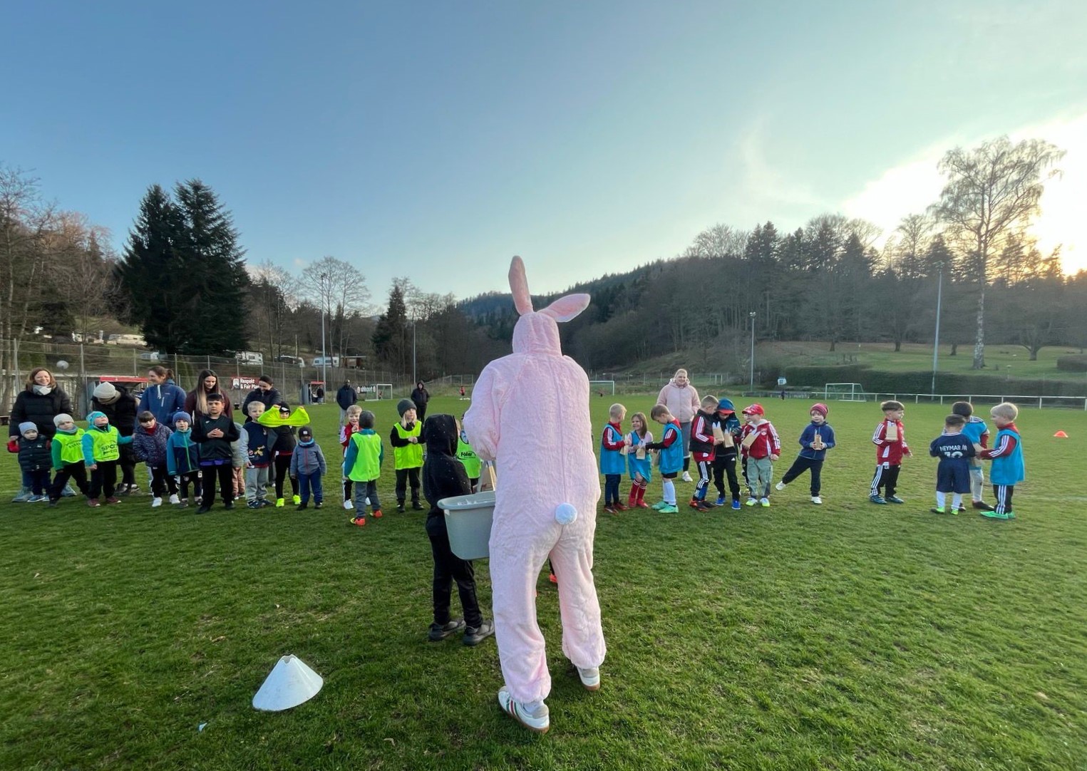 Die Kinder bedankten sich lautstark beim Osterhasen mit dem eigenen Schlachtruf von den Bambini Spielfesten: „Oberes – Albtal“ und „JSG Ole, Ole, Ole“.