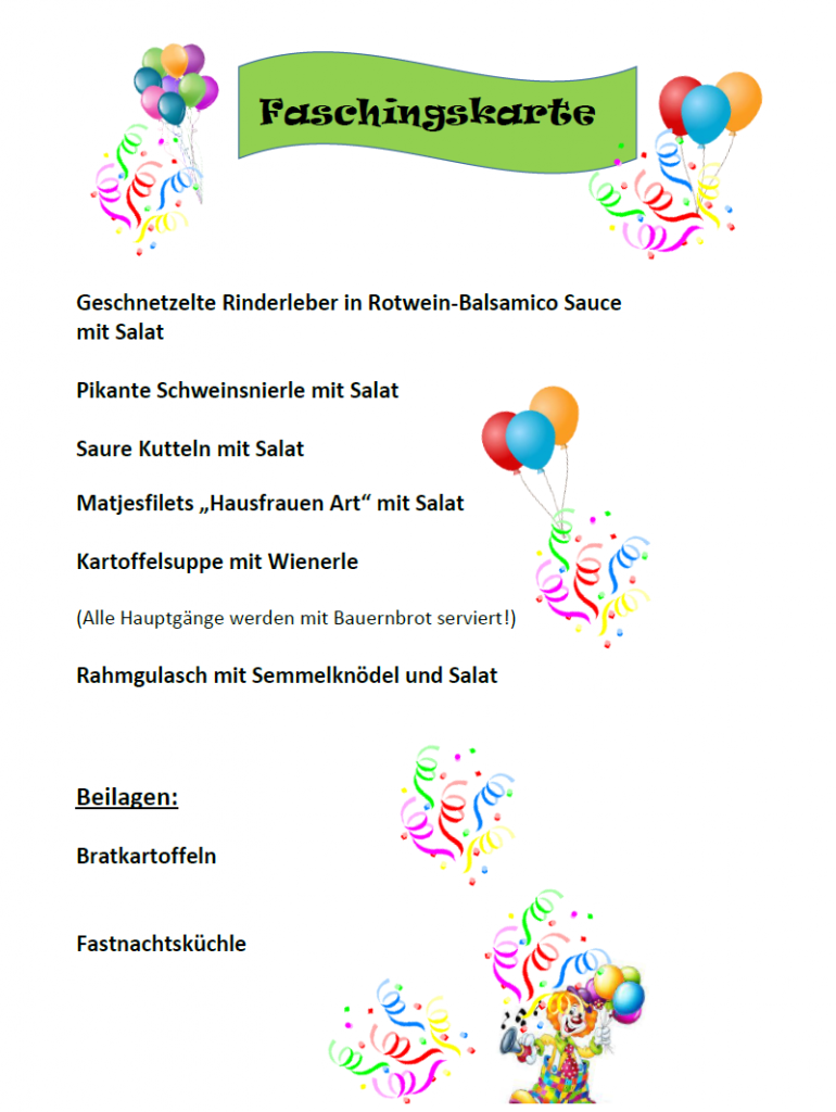 Das Gastroteam, rund um Tambourmajor Michl, zaubert am Dienstag wieder kulinarische Highlights auf die Teller, die passend zum Ausklang der Faschingszeit unter dem Motto „Saueressen“ stehen. Selbstverständlich ist auch für unsere „herzhaften“ und auch „süßen“ Gäste etwas dabei, sodass jeder etwas auf der Karte findet. Fleisch, Fisch, Vegetarisch und auch süße Nachspeise lassen keinen Wunsch offen. Wir freuen uns, euch in geselliger Runde und närrischer Atmosphäre im Sportheim in der Schwimmbadstraße begrüßen zu dürfen.