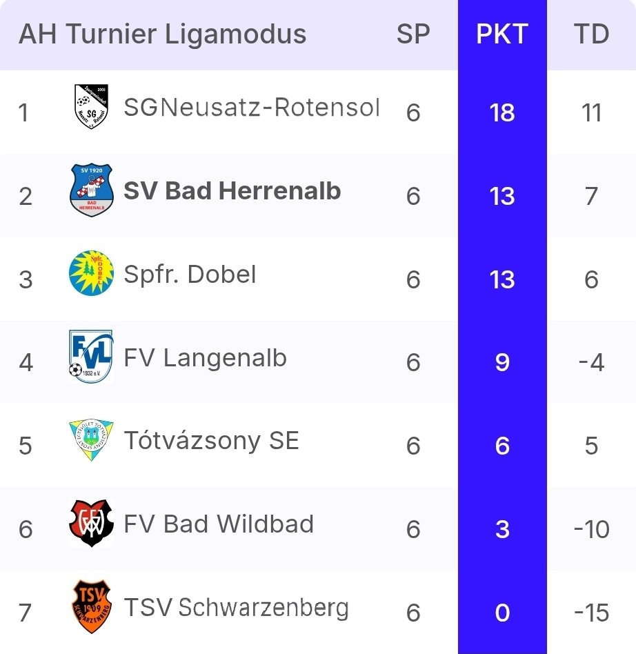 Beim Hallenturnier der Sportfreunde Dobel spielte unsere AH gegen sechs weitere Teams im Liga-Modus um den Turniersieg. Mit elf Spielern und weiteren sechs als Zuschauer auf den Rängen waren wir stark vertreten. Zum Auftakt ging es gegen die Gastgeber der Sportfr. Dobel. In einer engen Partie gelang Rapha mit dem Schlusspfiff, also wirklich in aller letzter Sekunde, der Treffer zum 2:2. Selbst im köllner Keller konnte man bei nach Ansicht eines Handyvideos des Treffers nicht sagen, ob der Ball beim Abpfiff vor, auf oder hinter der Linie war. Somit blieb die Entscheidung auf dem Feld bestehen. Spiel zwei gegen FV Wildbad ging dann auch in der Höhe deutlich mit 3:1 an unsere AH-Truppe. Im Anschluss wartete mit der SG Neusatz-Rotensol das Derby der ehemaligen SpG-Vereine. Dieses Mal ging das hochwertige Spiel zu Gunsten der Neusatz-Rotensoler aus, die mit 0:2 die Oberhand behielten. Jetzt war klar: Nur bei Siegen in den letzten drei Spielen ist besteht noch die hypothetische Chance auf den Turniersieg. Dieser Pflicht kam das Team mit 5:2 gegen FV Langenalb und dem 4:1 gegen TSV Schwarzenberg nach. Insbesondere das 2:1 gegen Totvazsony SE war eine gelungene Revenge für die Finalniederlage des letzten Jahres. Leider leistete sich die SG keinen Ausrutscher und stand am Ende mit sechs Siegen auf Platz eins. Platz zwei ging wegen Punktgleichheit und Unentschieden im direkten Vergleich mit dem um ein Tor besseren Torverhältnis an uns, während die Gastgeber den 3.Platz belegten.