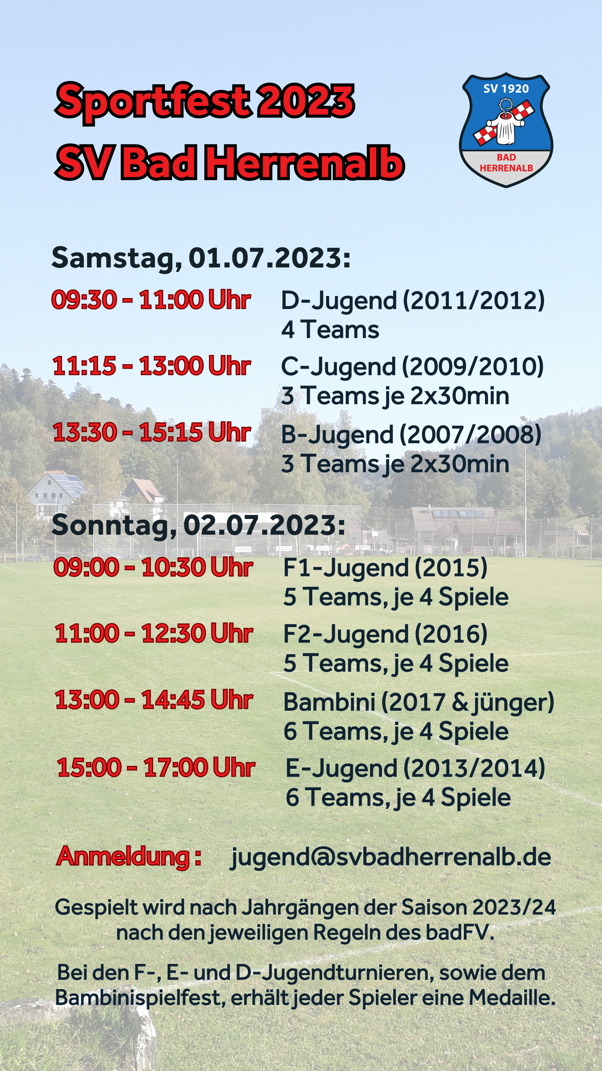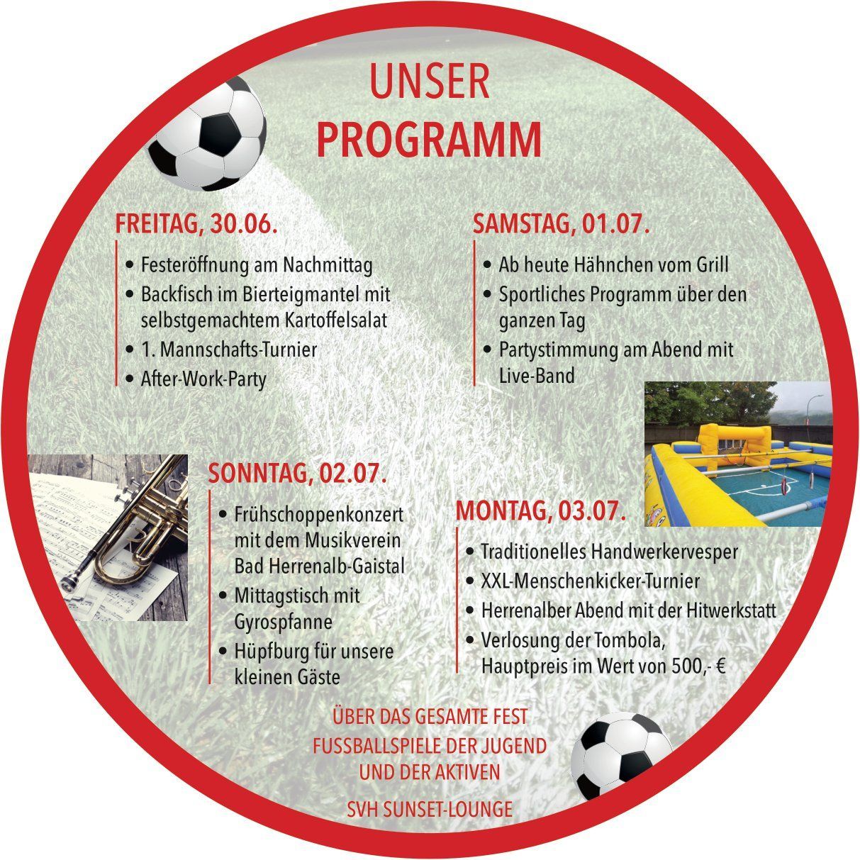Den Anfang macht die Aktivität mit einem Blitzturnier am Freitagabend. Am Samstag starten dann die D-, C- und B-Jugend, ehe erneut Spiele von Herrenteams anstehen. Sonntags beginnen mit der E-, F-Jugend und den Bambini unsere jüngsten, ehe die Zweite Mannschaft, sowie die AH spielen. Den Abschluss bildet ein XXL-Menschenkicker-Turnier der örtliche Vereine am Montag Nachmittag.