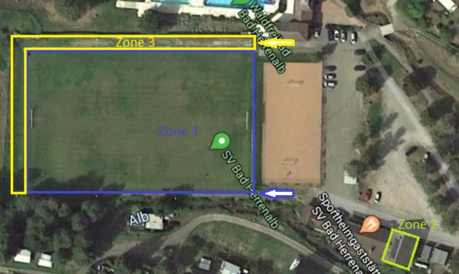 – Betreten des Sportplatzes nur über denvorgesehenen Zugang (Gelb: Zuschauer, Blau: Spieler/Trainer/Betreuer)
