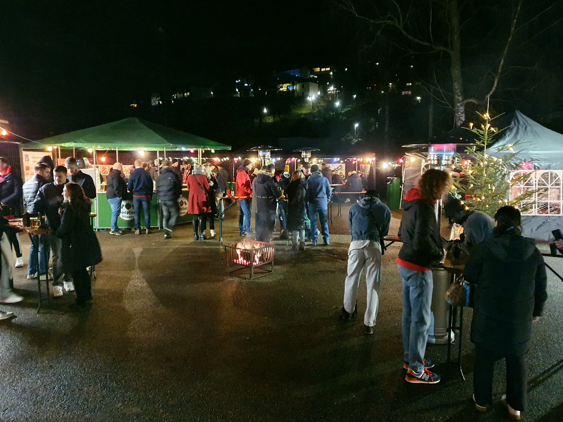 Hierfür wurde am letzten Arbeitseinsatz (30.11.) bereits begonnen aufzubauen und am Morgen des 07.12. wurden dann auch noch die Zelte gestellt und mit Reißig und Lichterketten dekoriert. Auch ein Christbaum, sowie mehrere Schwedenfeuer und Feuerkörbe wurden aufgestellt, um für ein tolles Ambiente zu sorgen. So strahlten die knapp einhundert Gäste schon als sich zum Sportheim kamen. Neben den aktiven Spielern der 1. und 2. Herrenmannschaft, den Spielerinnen der Damen-Freizeitmannschaft und den AH-Kickern, waren auch die B- und C-Juniorinnen geladen. Auch die Vorstandschaft, Ausschussmitglieder und Ehrengäste freuten sich über den tollen Aufbau und das Zusammenkommen. Das Gastroteam sorgte für mehrere kulinarische Highlights. Neben traditionellen Weihnachtsmarkt-Speisen wie Schupfnudeln mit Sauerkraut, Reibekuchen mit Apfelmus, Kartoffelsuppe und von „Vereinsmetzger“ Huck selbstgemachter Bratwurst, gab es auch Spießbraten, Burger, Pommes, Salate, sowie Waffeln und Kuchen als Nachspeise.
