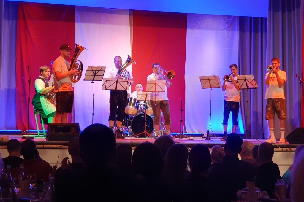 Im nächsten Programmpunkt blieb es musikalisch. Die Band „Hartz 5“ unter der Leitung von Tobias Siegwart benannte sich im Laufe des Abends in „Bürgergeld 8“ um und interpretierte bekannte Popsongs im Blasmusik-Style sowie mit Gesang und brachte das Publikum zum Mitsingen.