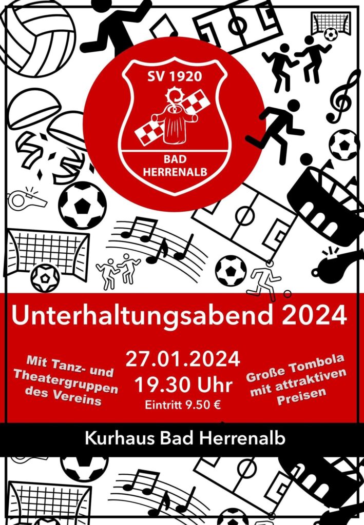 Am Samstag, 27.01., lädt der SV Bad Herrenalb zum traditionellen Unterhaltungsabend ab 19:30 Uhr ins Kurhaus ein. Die Bambini und F-Jugend eröffnen das Programm bevor Vorsitzender Frank Hamberger die Gäste begrüßt. Im ersten Teil des Abends unterhält die Laien-Theatergruppe das Publikum mit einem kurzweiligen und lustigen Stück, ehe es in eine kurze Pause geht. In dieser werden unsere Spieler der Aktivität Lose für die Tombola verkaufen. Neben attraktiven Hauptpreisen werden auch viele Sofortpreise dabei sein, sodass die Gewinnchancen gut stehen.