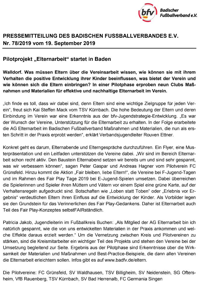 Die JSG Oberes Albtal wurde als Vertreter des Fußballkreises Karlsruhe ausgewählt, am Pilotprojekt „Elternarbeit“ mitzuwirken. Selbstverständlich nahmen wir dieses Angebot und die damit verbundene Aufgabe „voranzugehen und zu gestalten“ an, um bereits von Anfang an bei diesem wichtigen Thema beteiligt zu sein. Wir freuen uns auf einen konstruktiven Austausch und ein erfolgreiches Pilotprojekt!