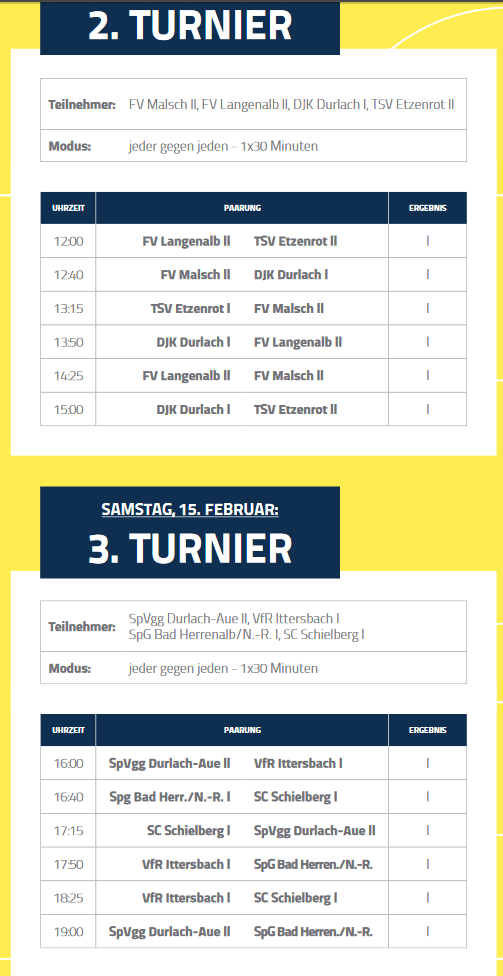 Unsere Reserve spielt ihr erstes Spiel um 12:40 Uhr und tritt als Ersatzmannschaft für DJK Durlach an. Unsere 1. Mannschaft spielt ab 16:40 Uhr. Beide Turniere bestehen aus drei Spielen mit jeweils 30 Minuten Spielzeit, also eine sehr kurzweilige und spannende Sache. Unterstützen Sie unsere Teams!