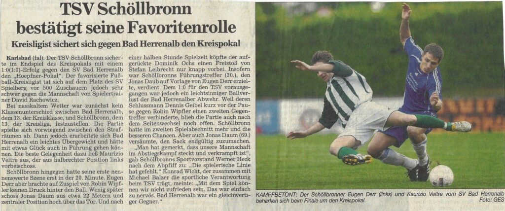 Das Finale ging dann knapp mit 0:1 verloren. Zu Beginn noch besser im Spiel und mit einer guten Chance zu Führung, wurden die favorisierten Schöllbronner im Verlauf stärker und erzielten den entscheidenden Treffer in der 30. Minute. Jedoch war es ein Spiel auf Augenhöhe und bis zum Abpfiff gaben die Spieler auf dem Platz und die mitgereisten Fans alles, um doch noch zum Erfolg zu kommen. Auch wenn nach dem Spiel die Köpfe hingen, da es nicht zum ganz großen Wurf reichte, war doch der Einzug ins Finale und die beeindruckende Atmosphäre des Spiels ein echtes Highlight für unsere Spieler und unserer Vereinsgeschichte. Wer sich nochmals ins Spielgeschehen zurückversetzen will, für den haben wir den Spielbericht der BNN vom 20.05.2010: